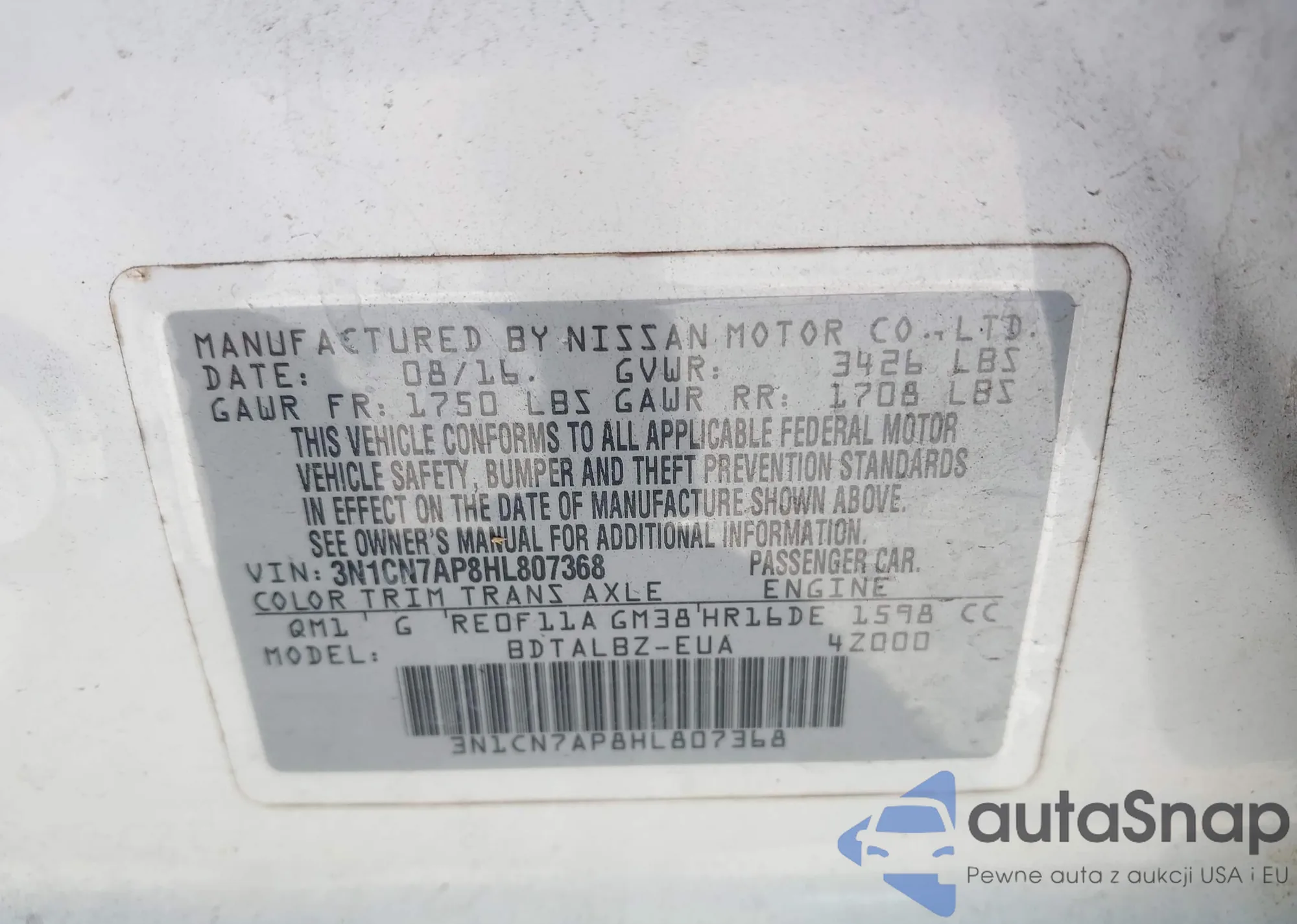• VIN 3N1CN7AP8HL807368