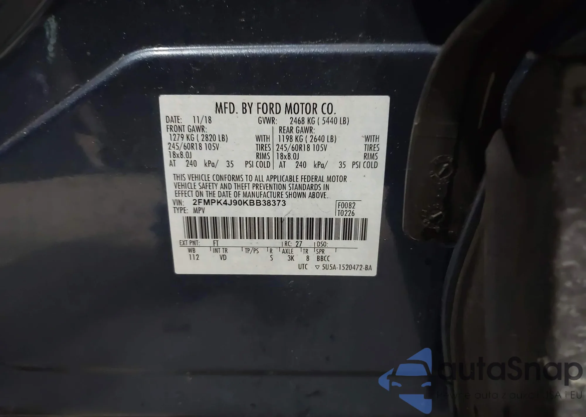 LOT: 42426479 VIN: 2FMPK4J90KBB38373