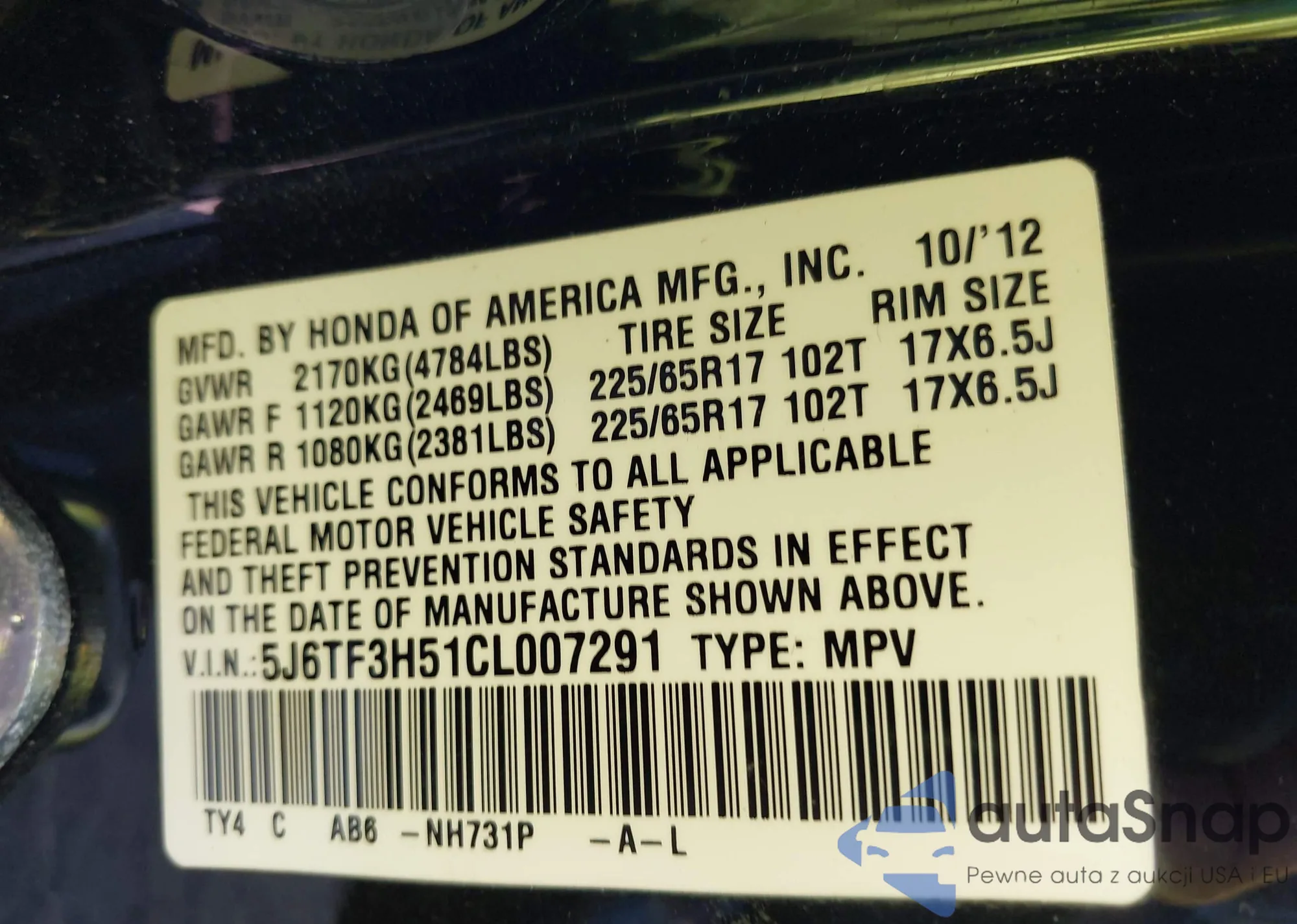 • VIN 5J6TF3H51CL007291