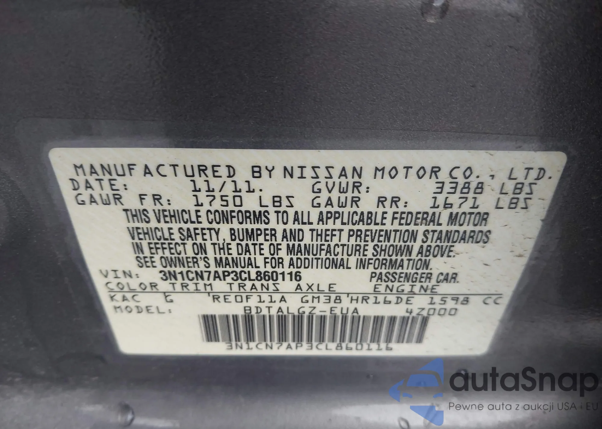 • VIN 3N1CN7AP3CL860116