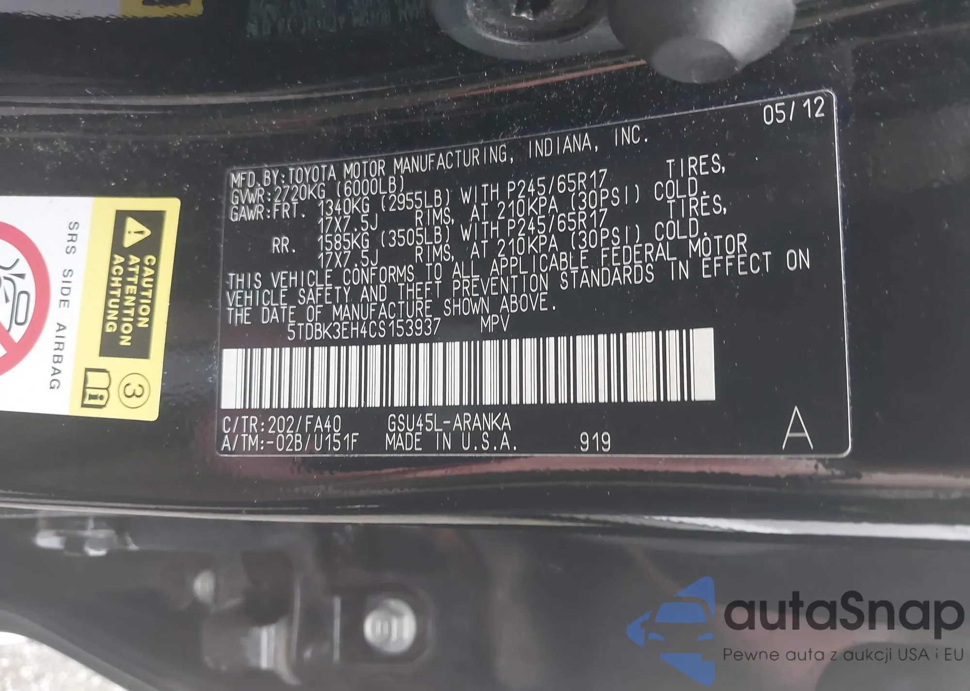 LOT: 42448322 VIN: 5TDBK3EH4CS153937