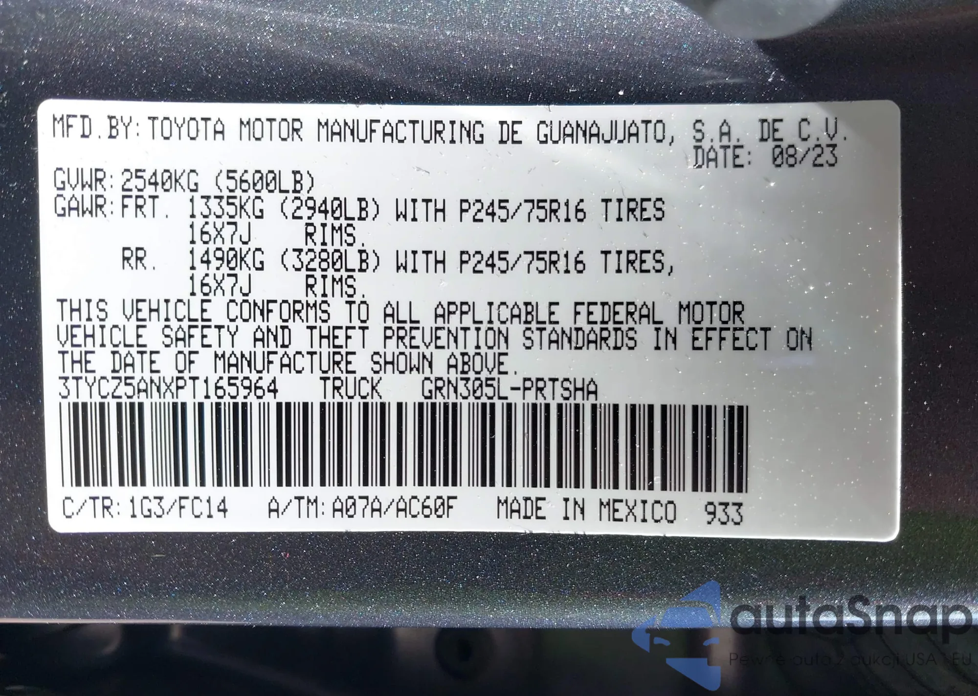 • VIN 3TYCZ5ANXPT165964