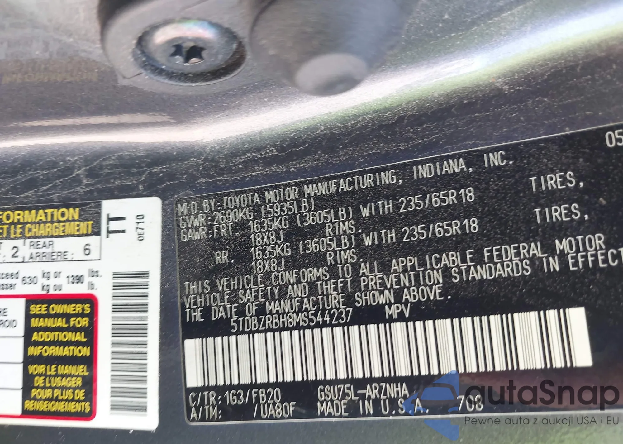 LOT: 39648267 VIN: 5TDBZRBH8MS544237