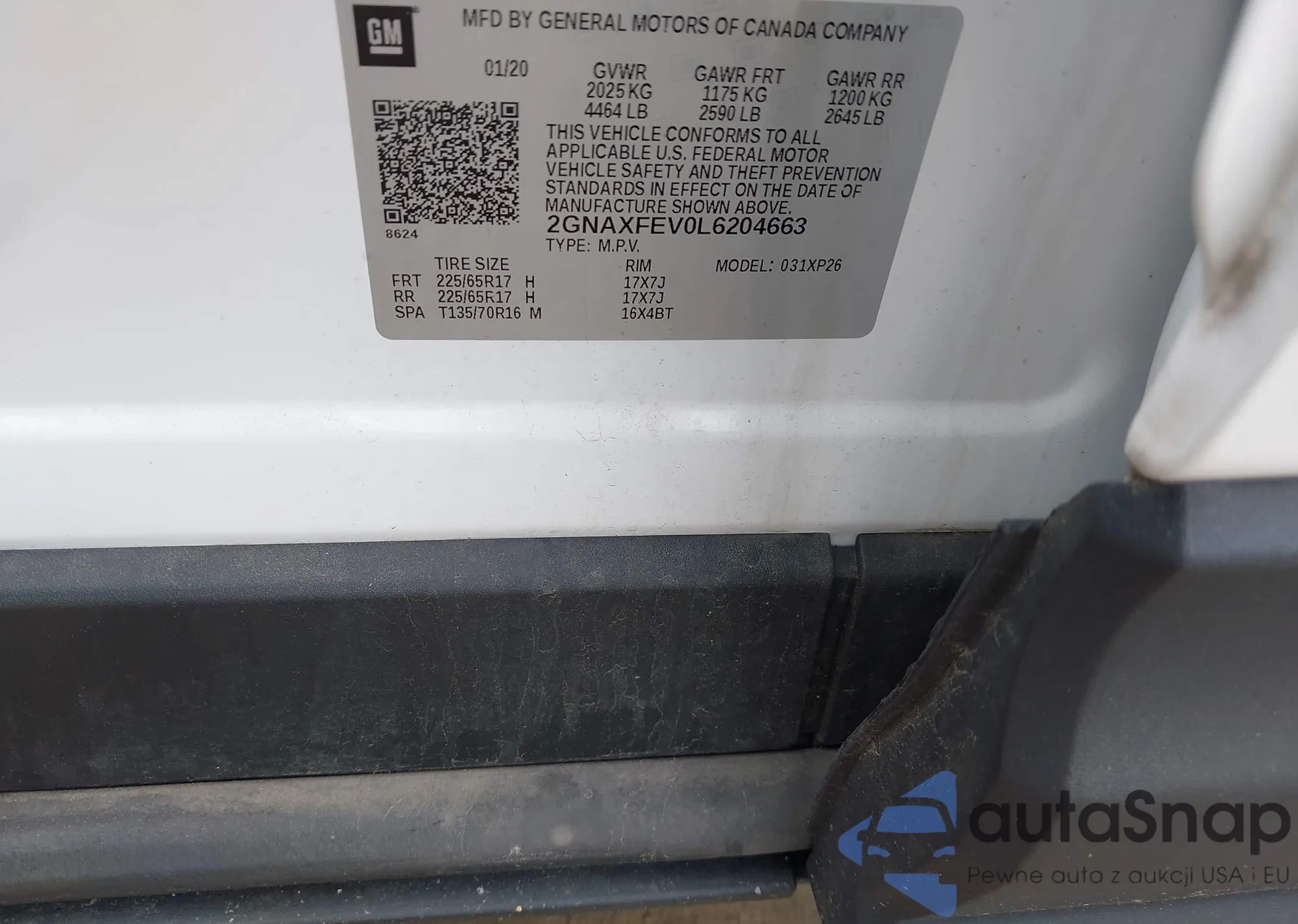 LOT: 42380038 VIN: 2GNAXFEV0L6204663