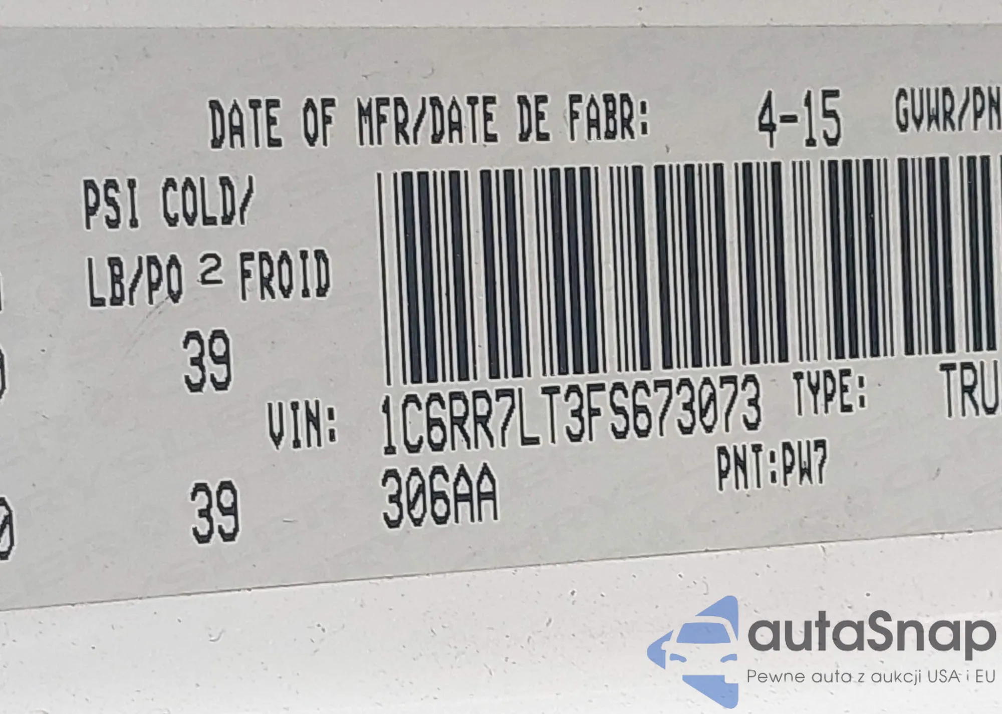 LOT: 41696978 VIN: 1C6RR7LT3FS673073