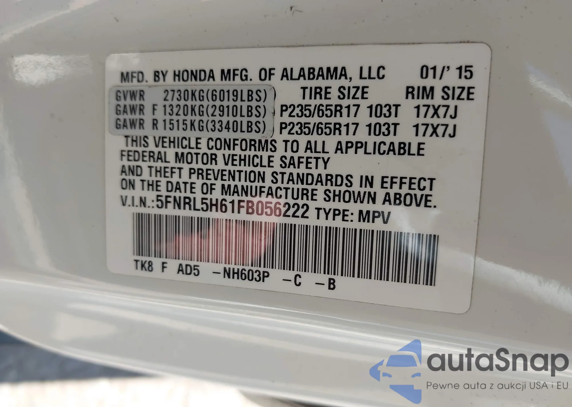 • VIN 5FNRL5H61FB056222