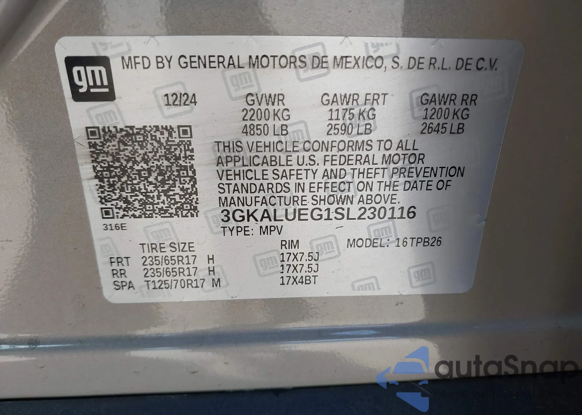 LOT: 42474555 VIN: 3GKALUEG1SL230116