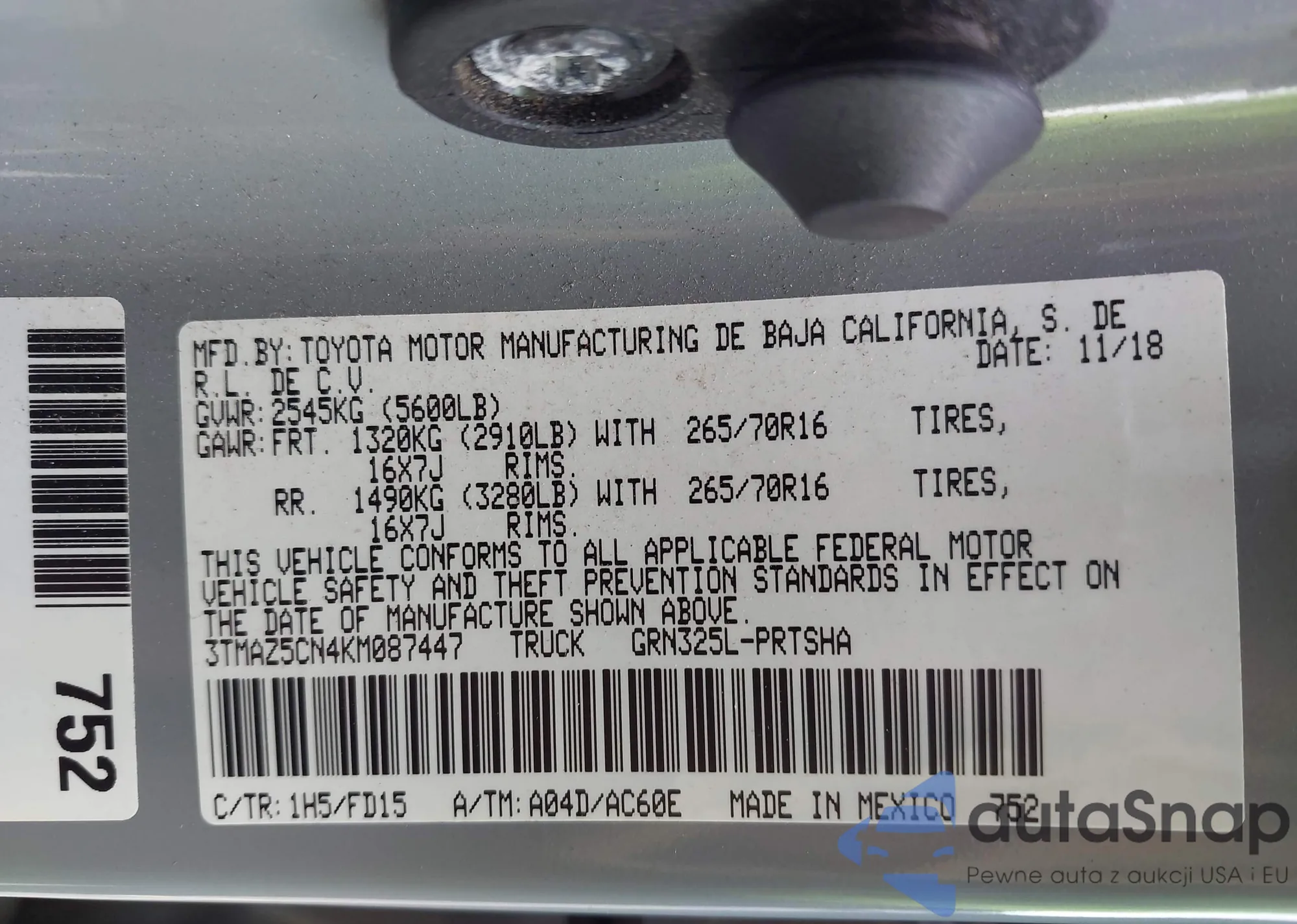 • VIN 3TMAZ5CN4KM087447