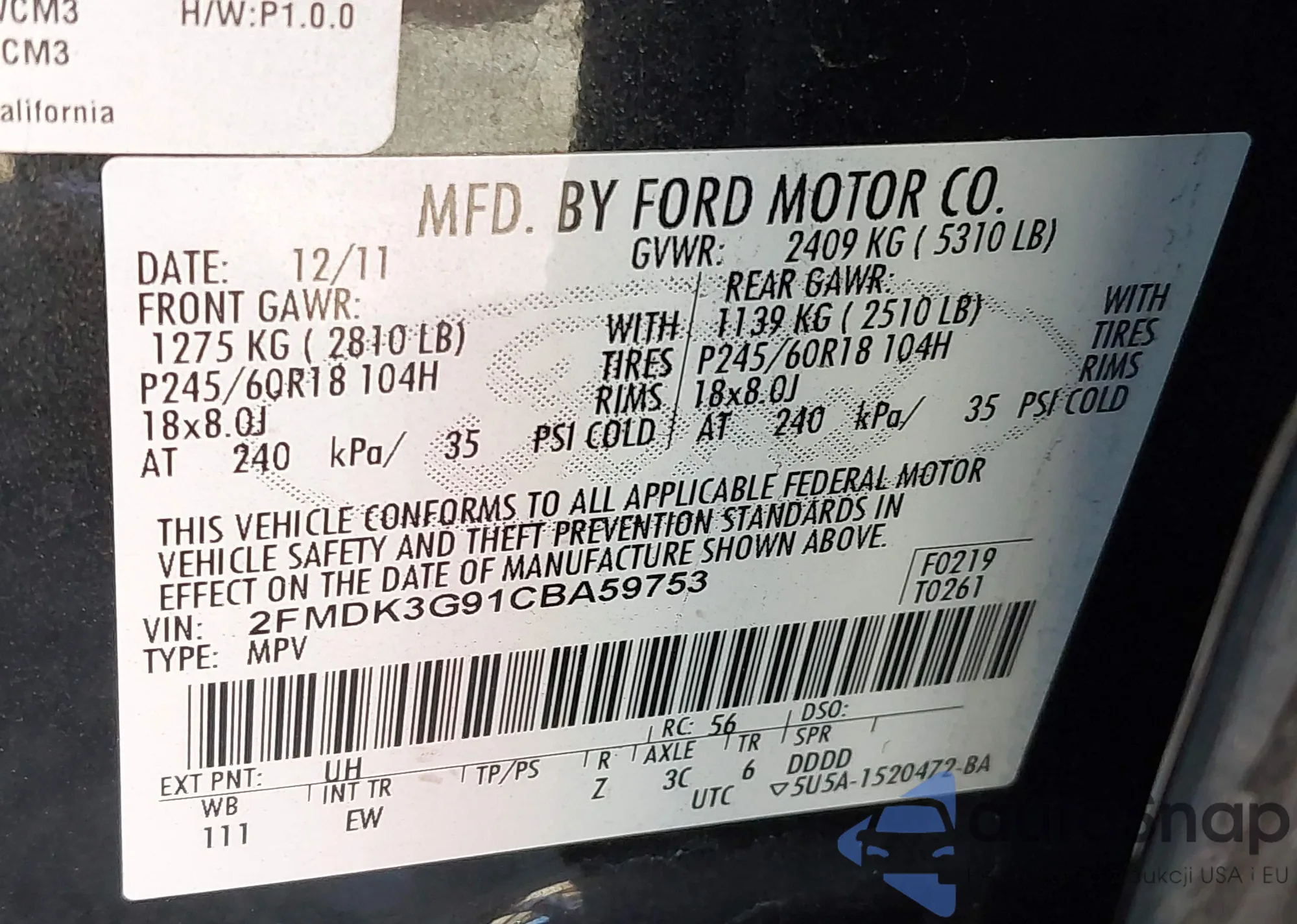 • VIN 2FMDK3G91CBA59753