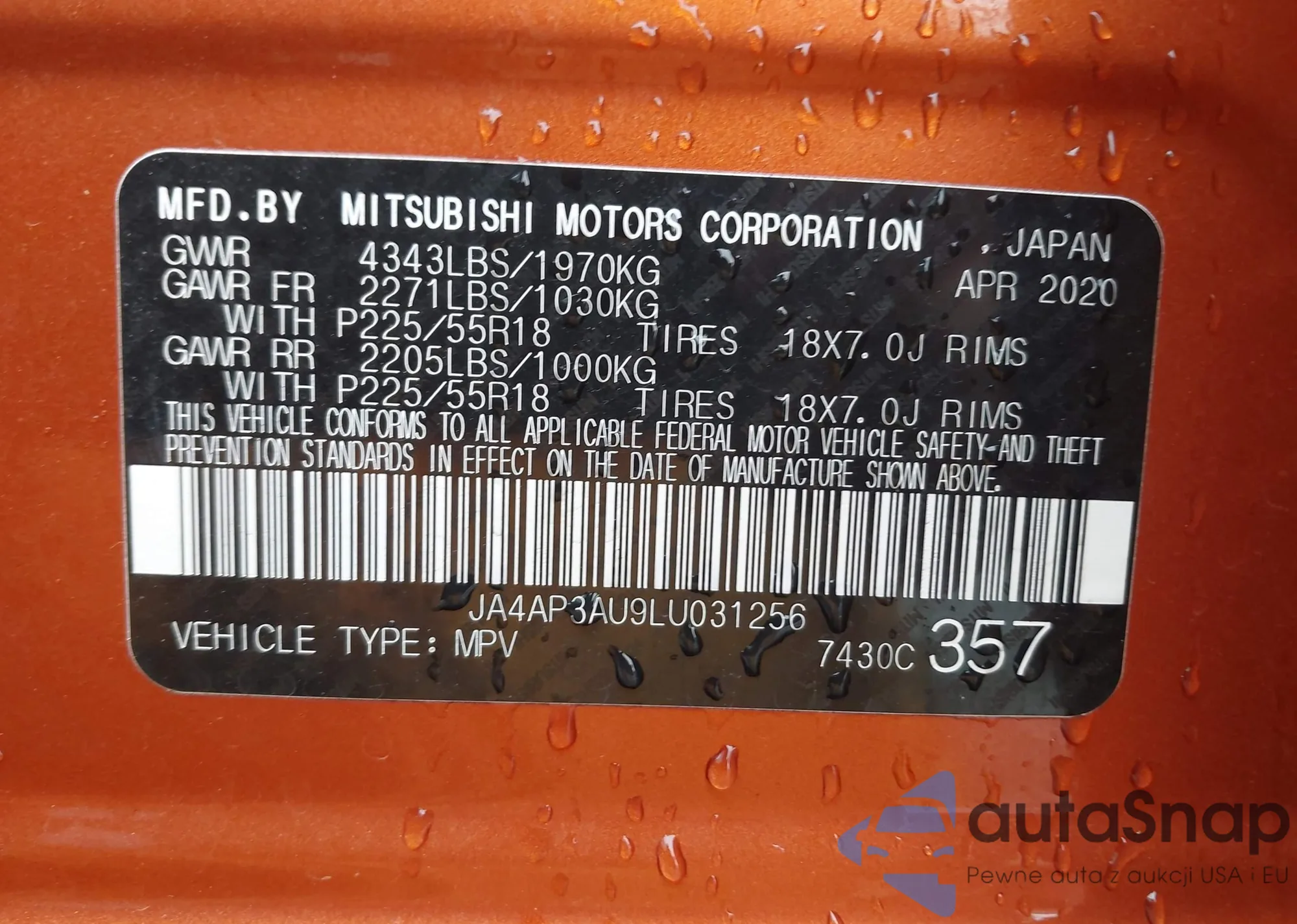 LOT: 42242198 VIN: JA4AP3AU9LU031256