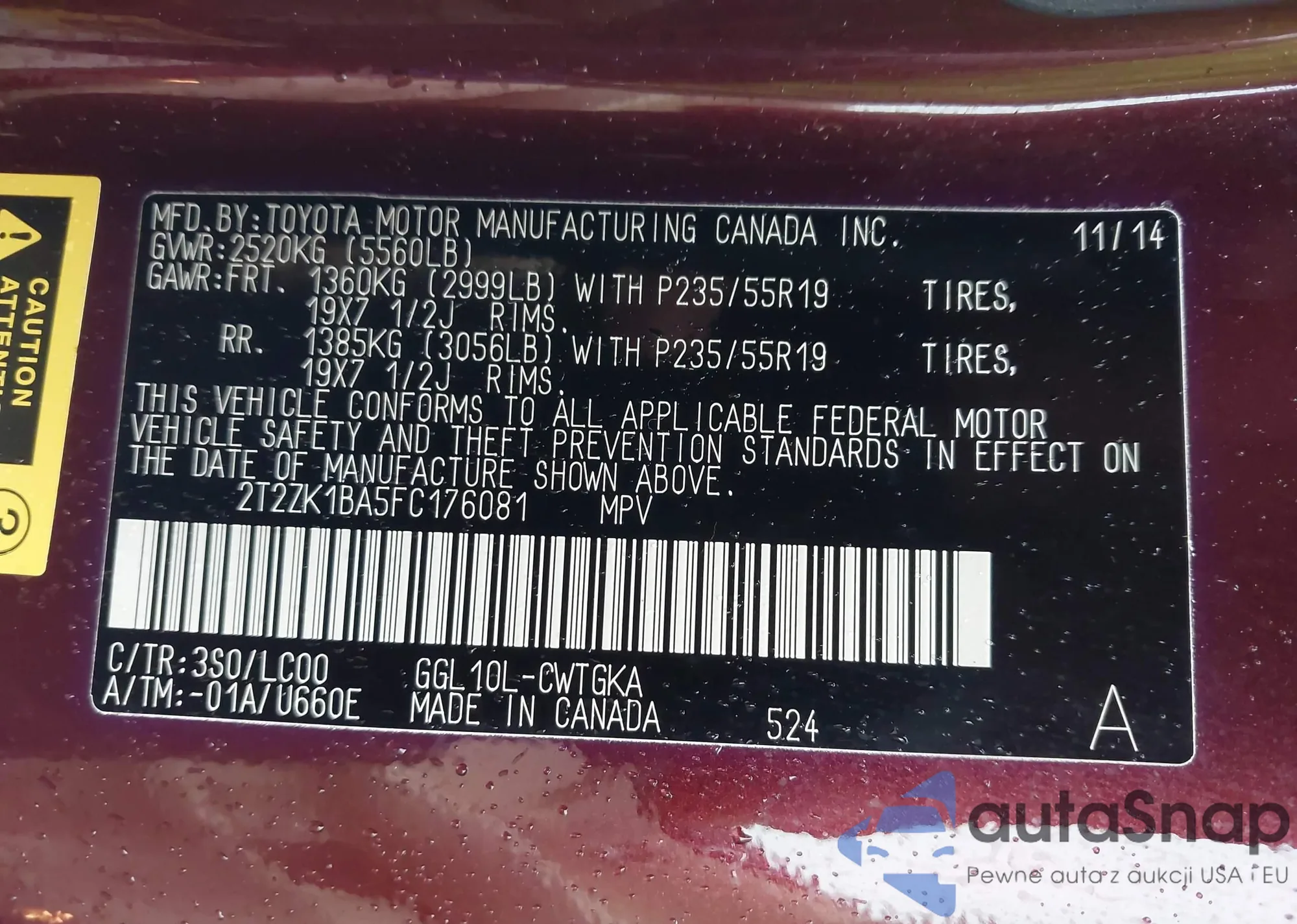 • VIN 2T2ZK1BA5FC176081