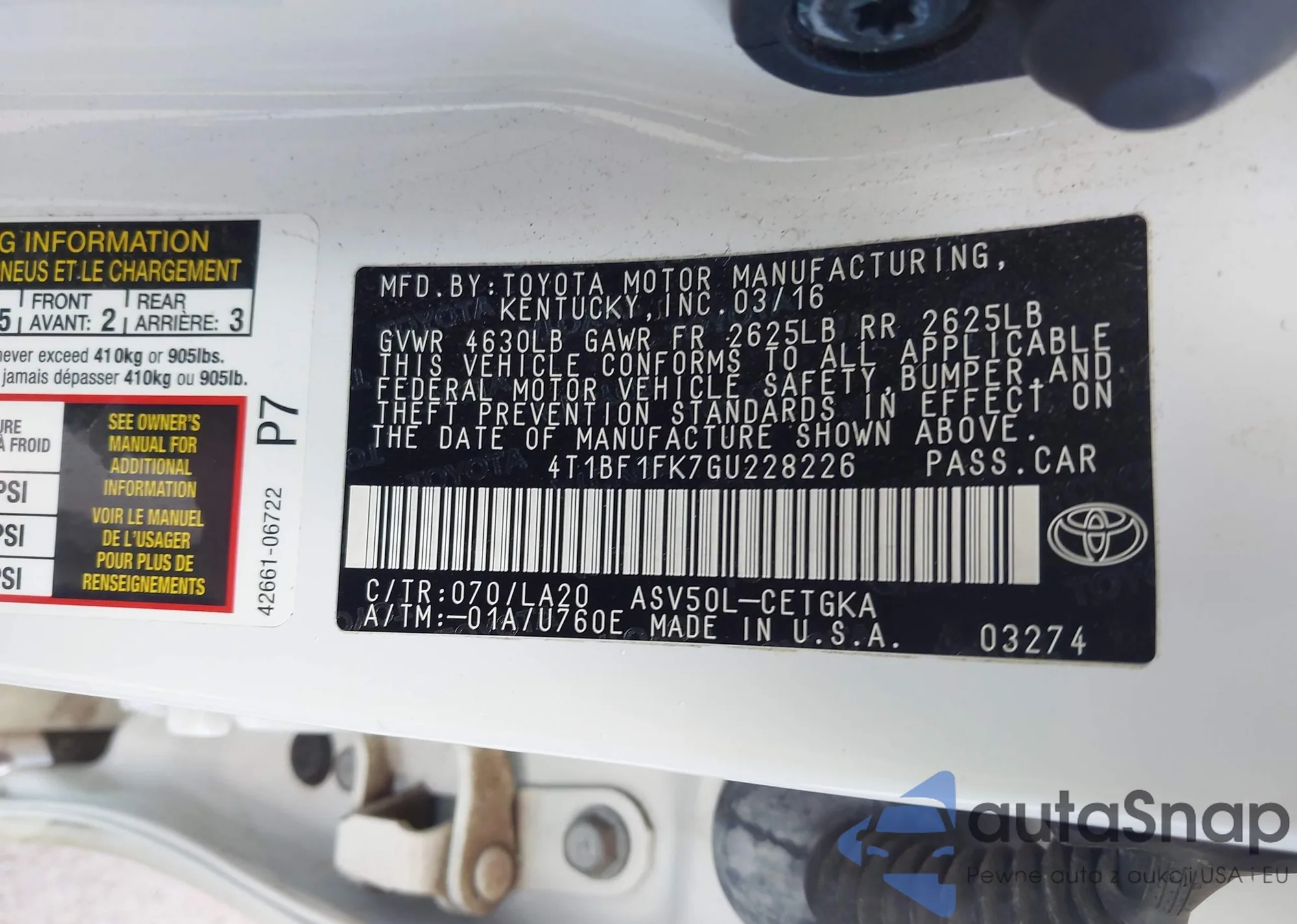 • VIN 4T1BF1FK7GU228226
