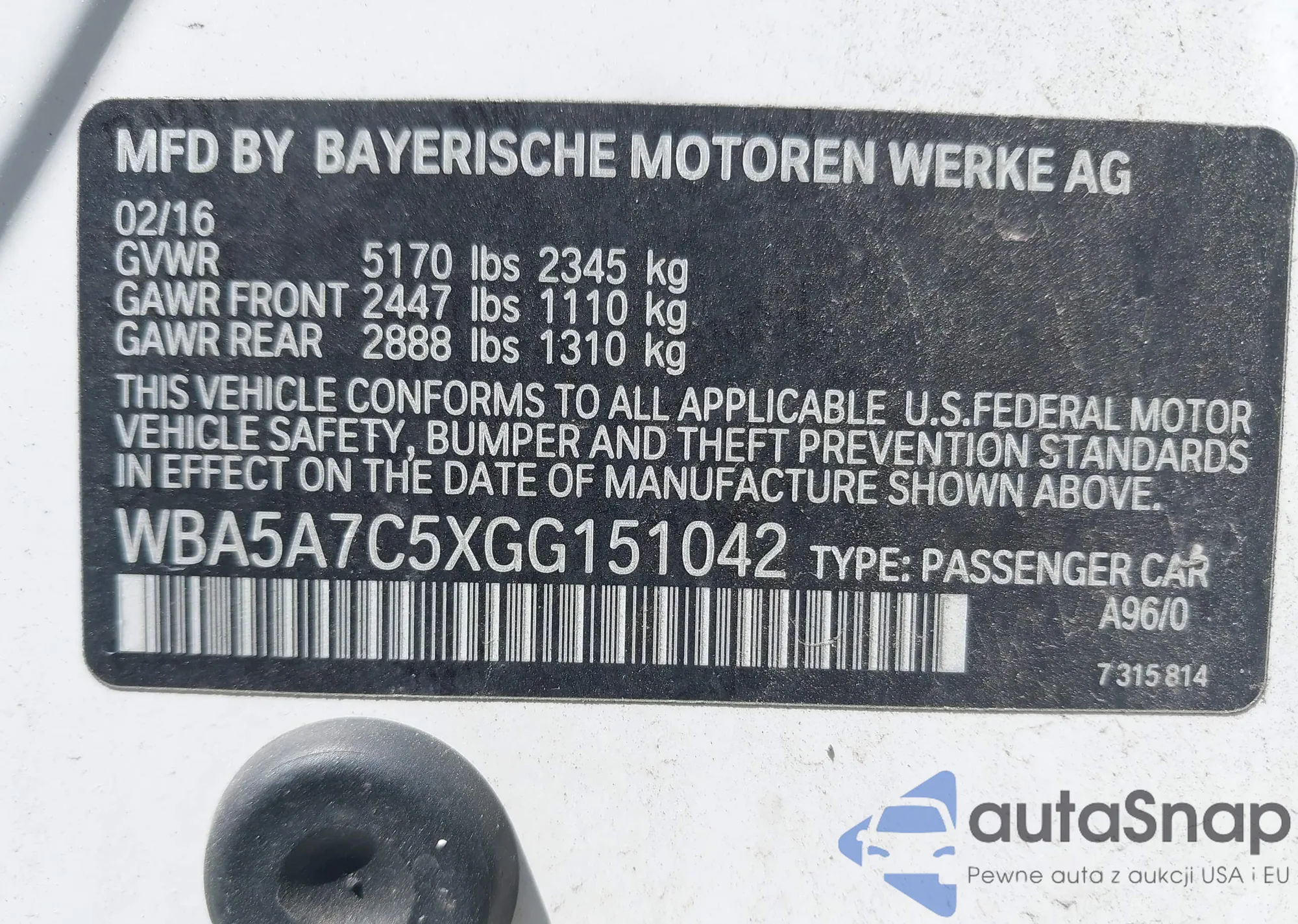 LOT: 42220401 VIN: WBA5A7C5XGG151042