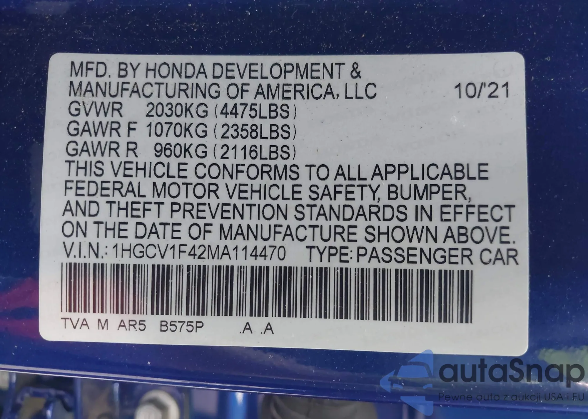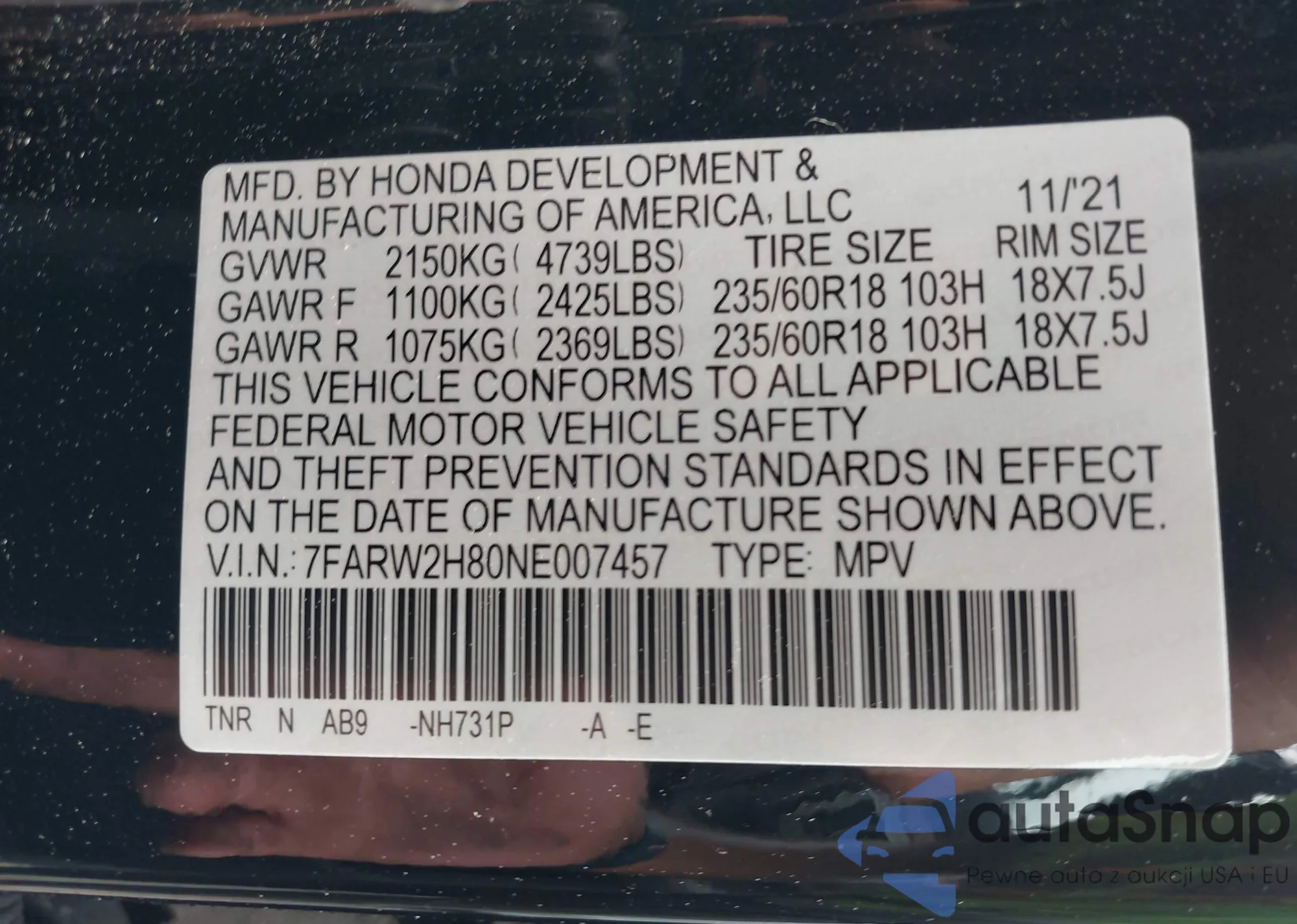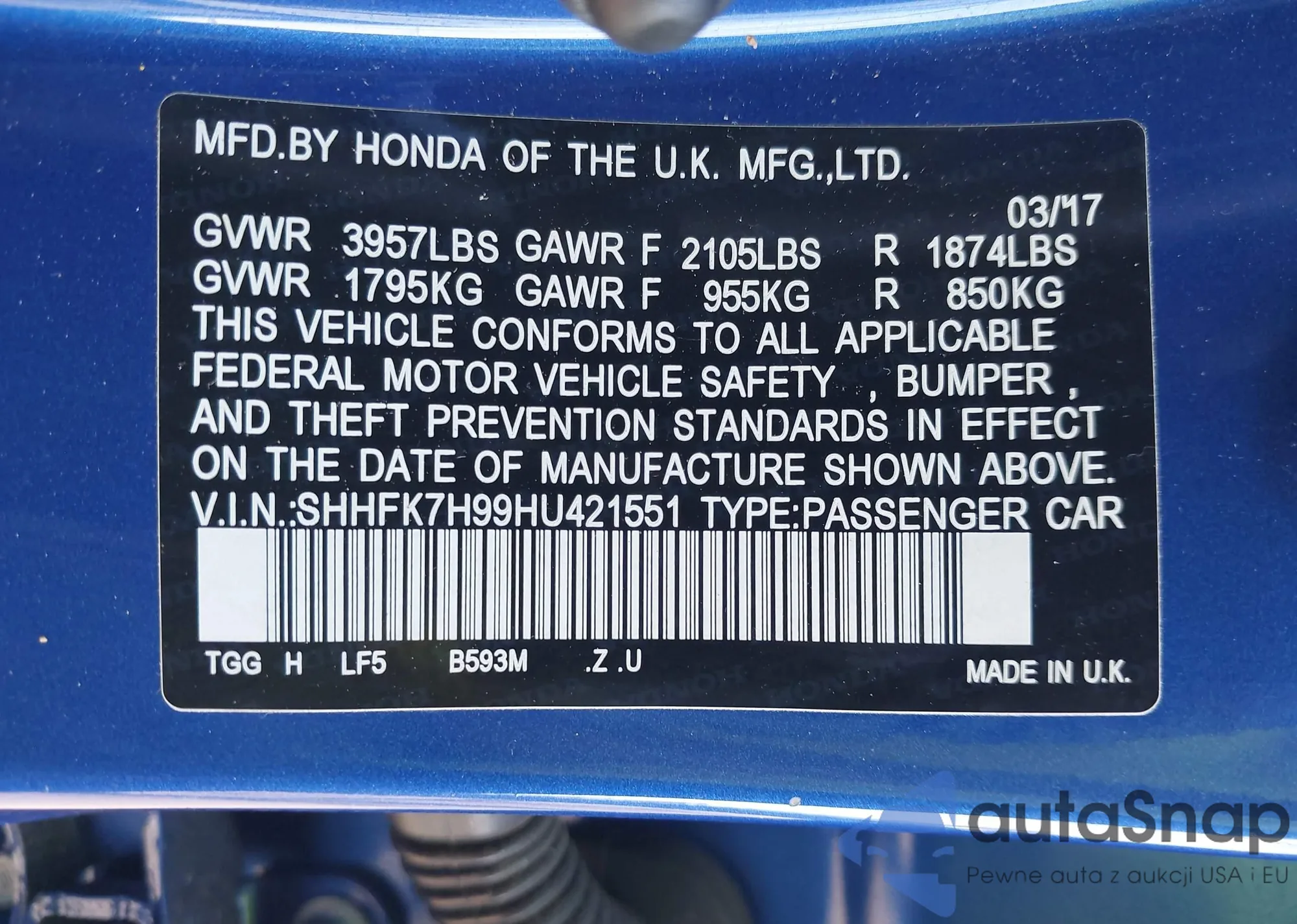 • VIN SHHFK7H99HU421551