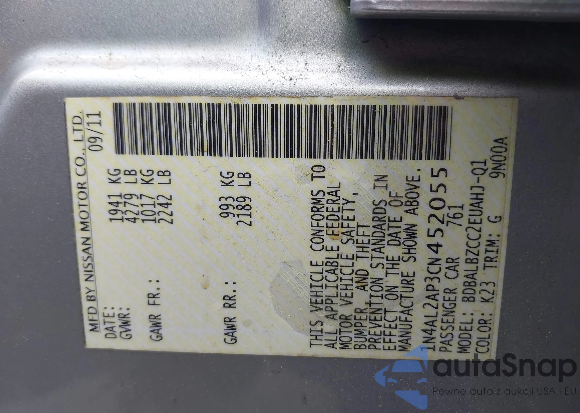 LOT: 42308346 VIN: 1N4AL2AP3CN452055