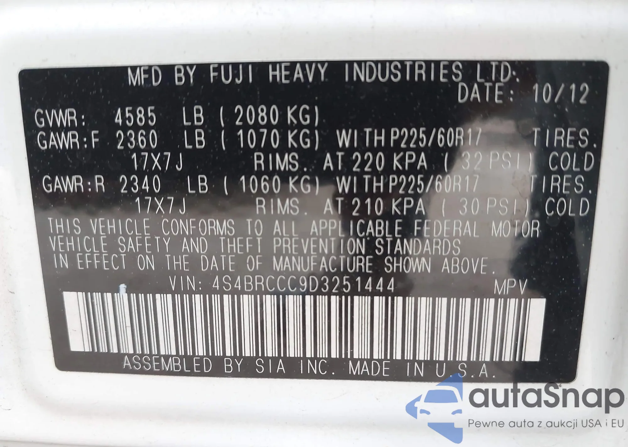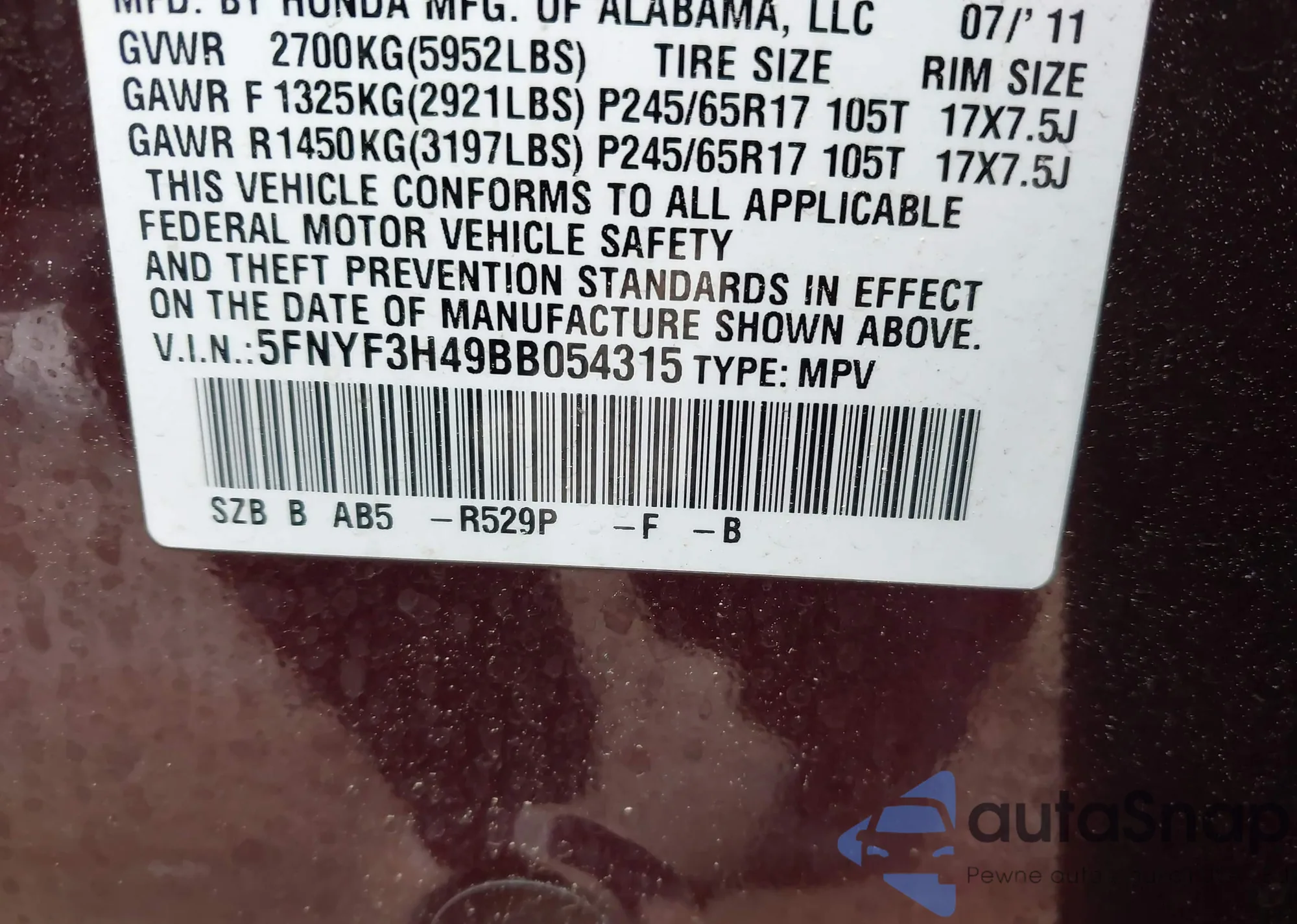 • VIN 5FNYF3H49BB054315