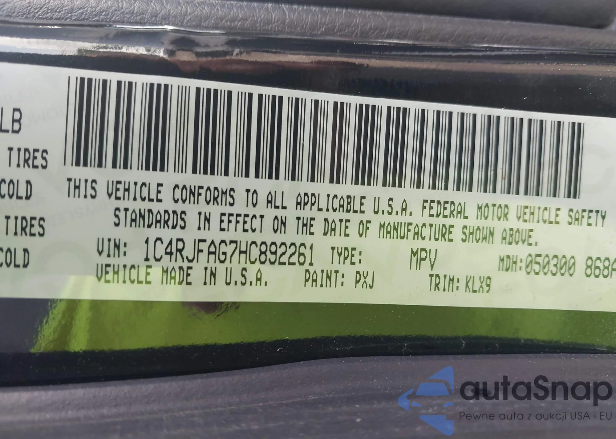 • VIN 1C4RJFAG7HC892261
