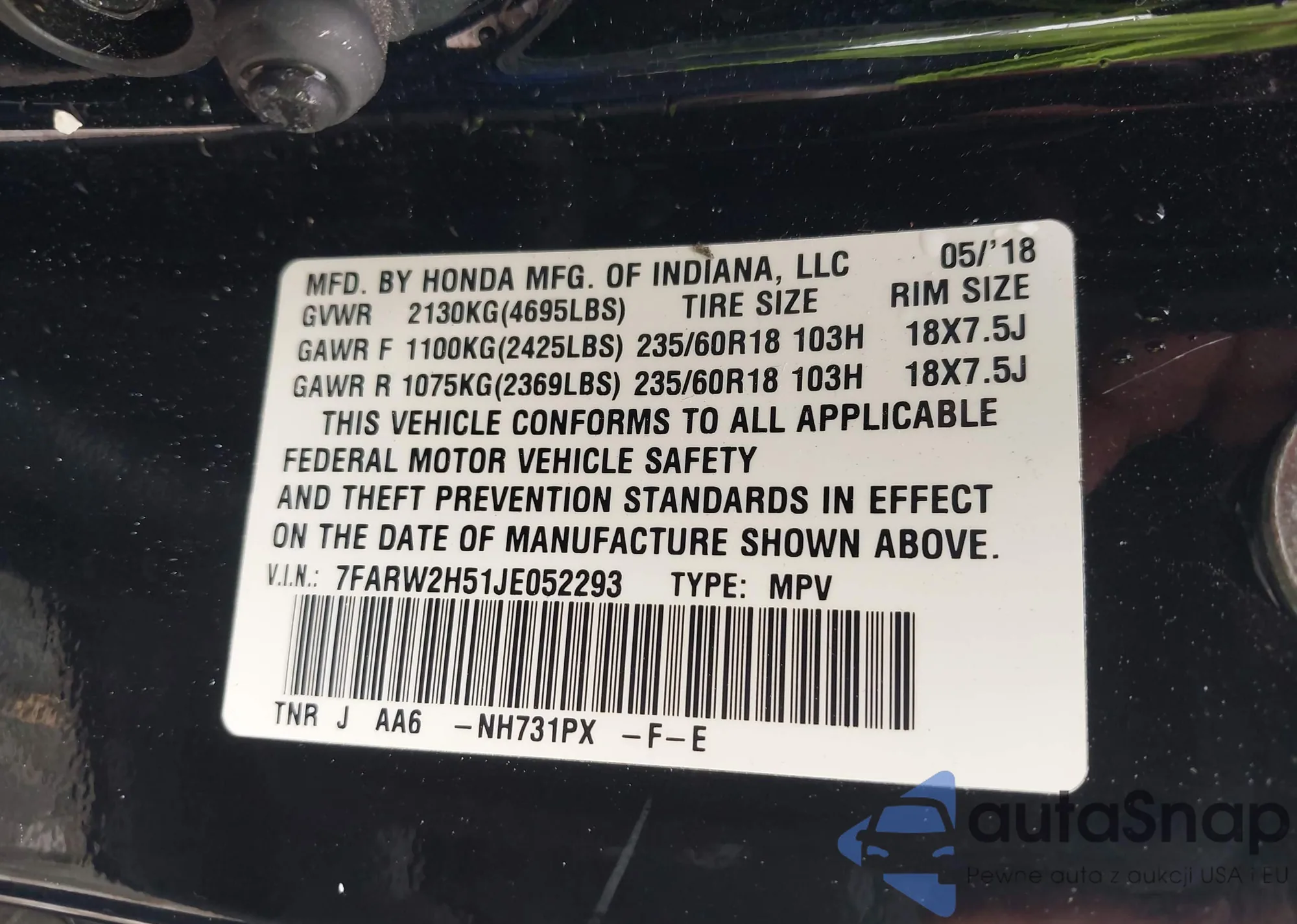 • VIN 7FARW2H51JE052293