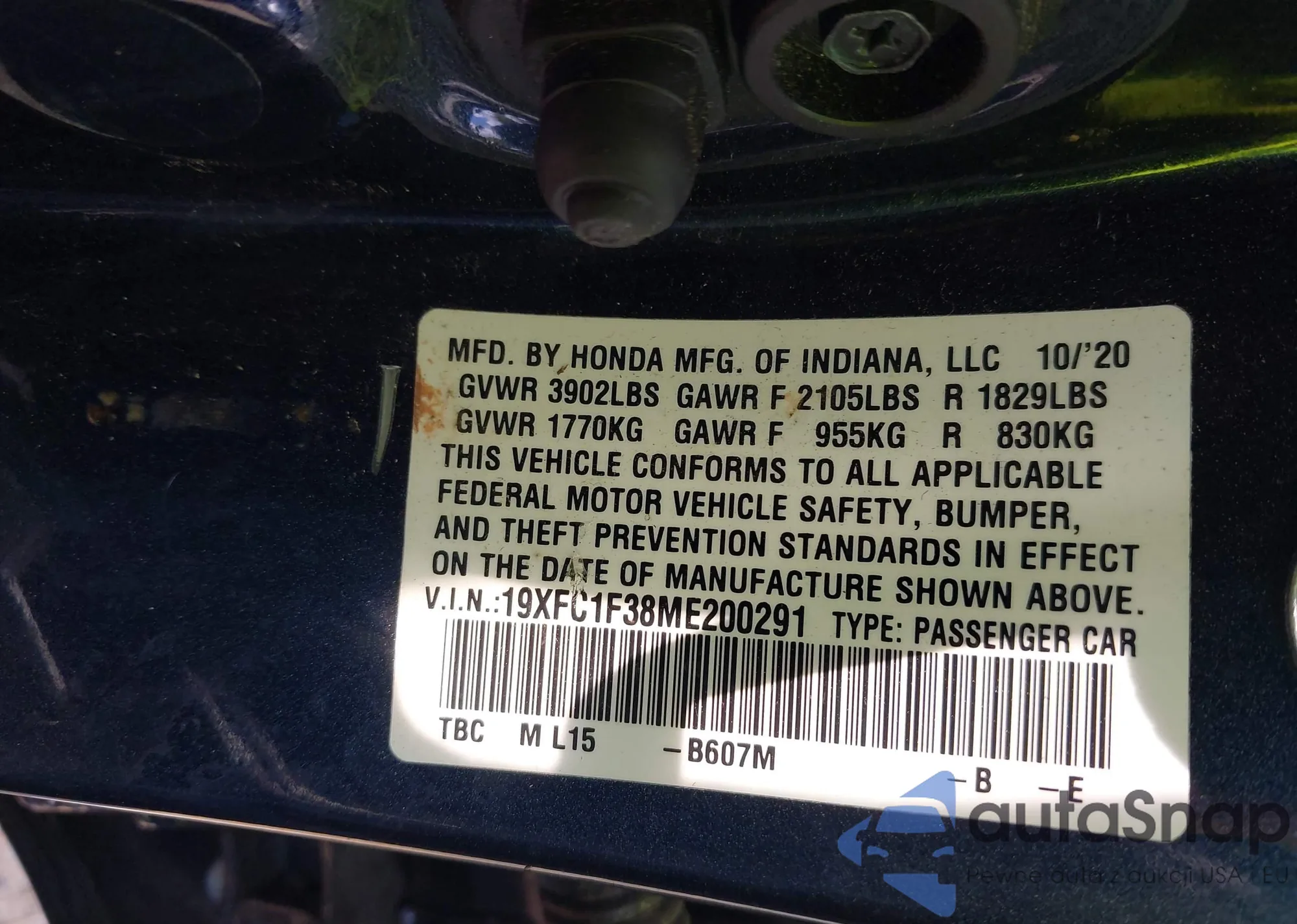 LOT: 42459192 VIN: 19XFC1F38ME200291