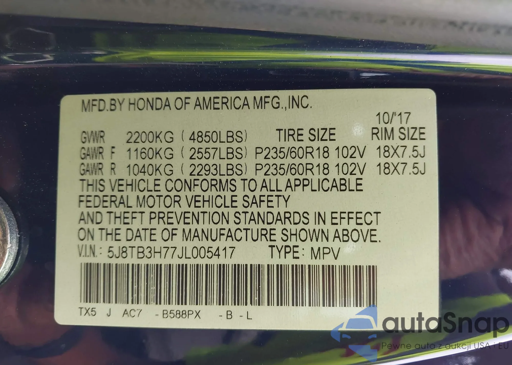 • VIN 5J6RW2H54LA006121