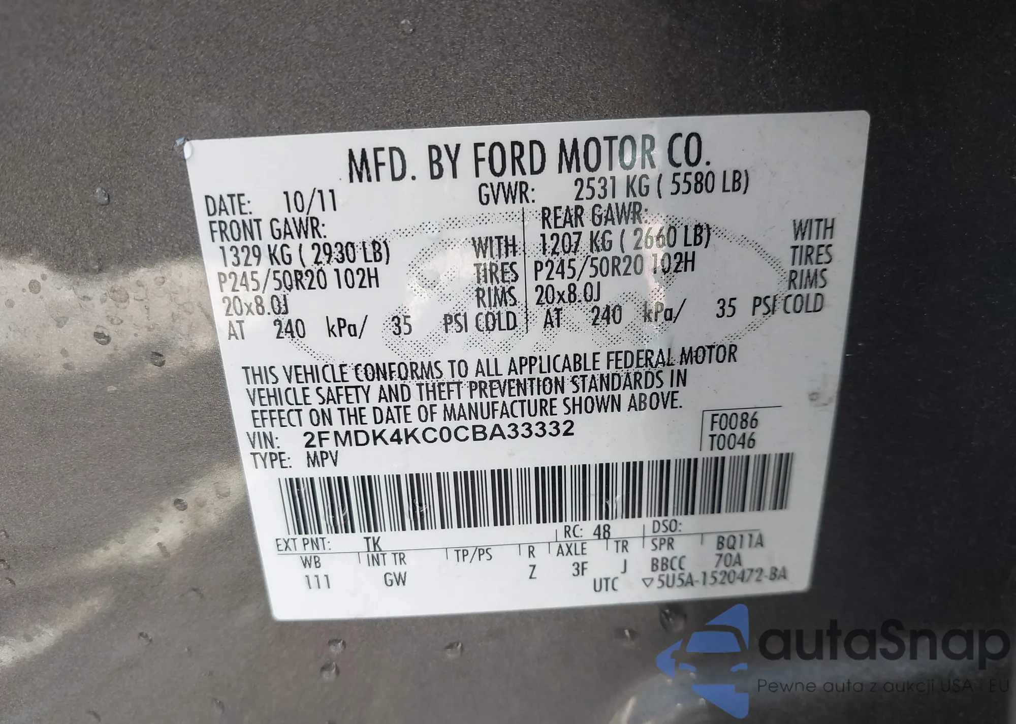 LOT: 42473276 VIN: 2FMDK4KC0CBA33332