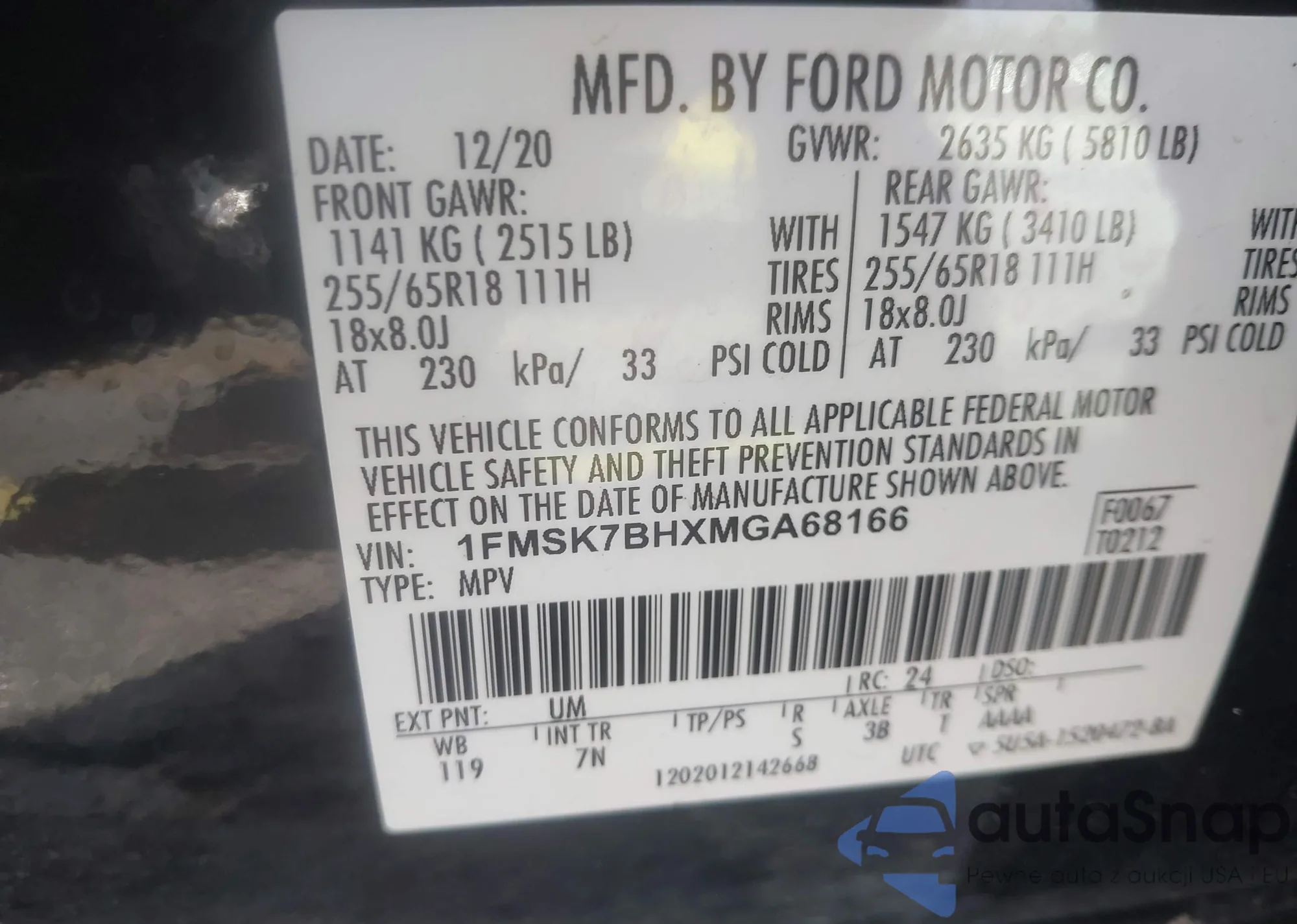LOT: 42005801 VIN: 1FMSK7BHXMGA68166
