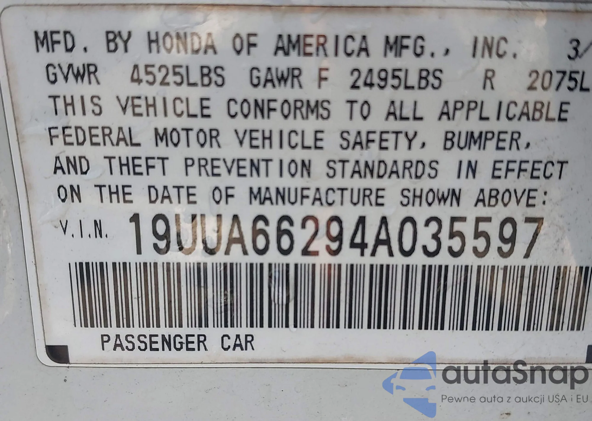 LOT: 42140034 VIN: 19UUA66294A035597