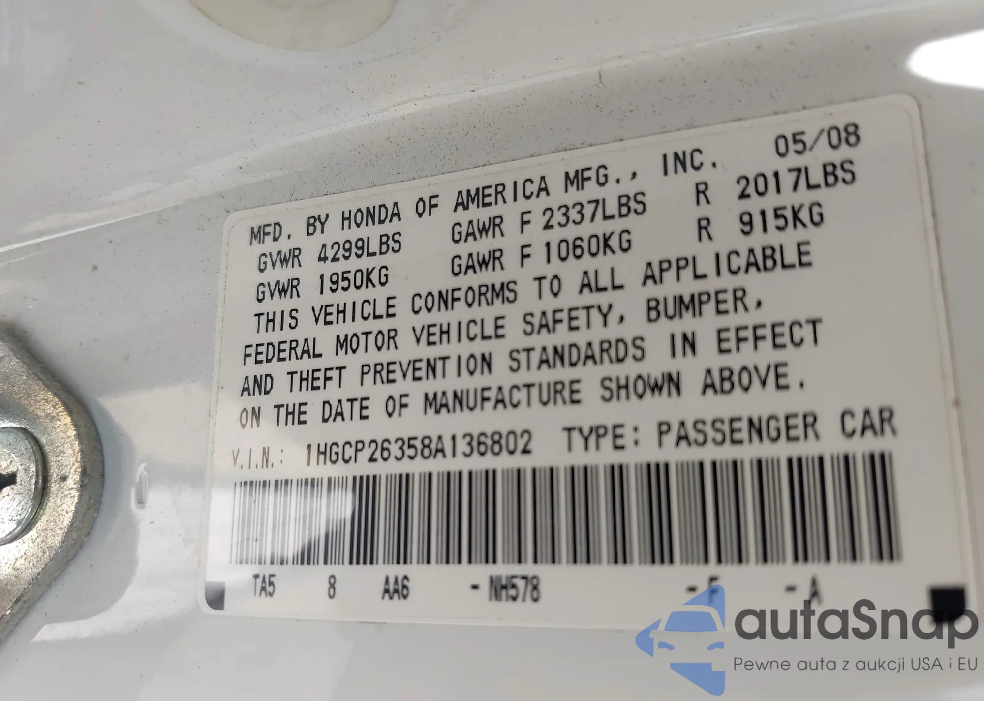 LOT: 42532900 VIN: 5J8TB182X8A019147