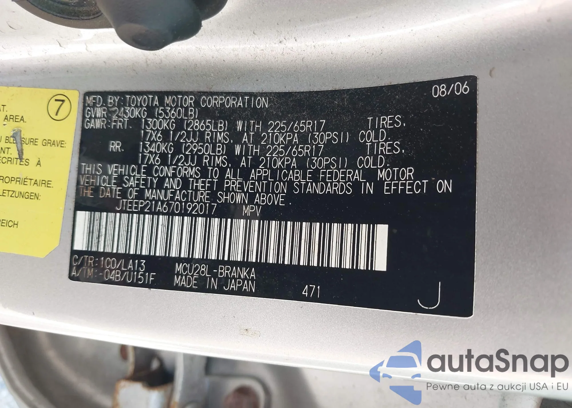 LOT: 42571107 VIN: JTEEP21A670192017