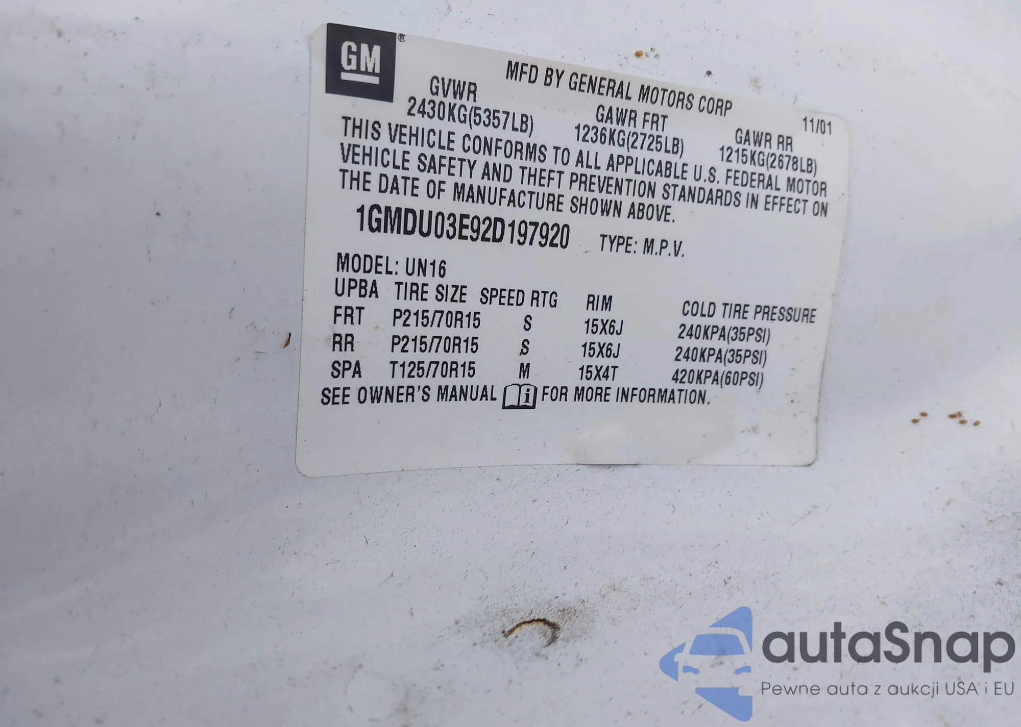 LOT: 41274256 VIN: 1GMDU03E92D197920