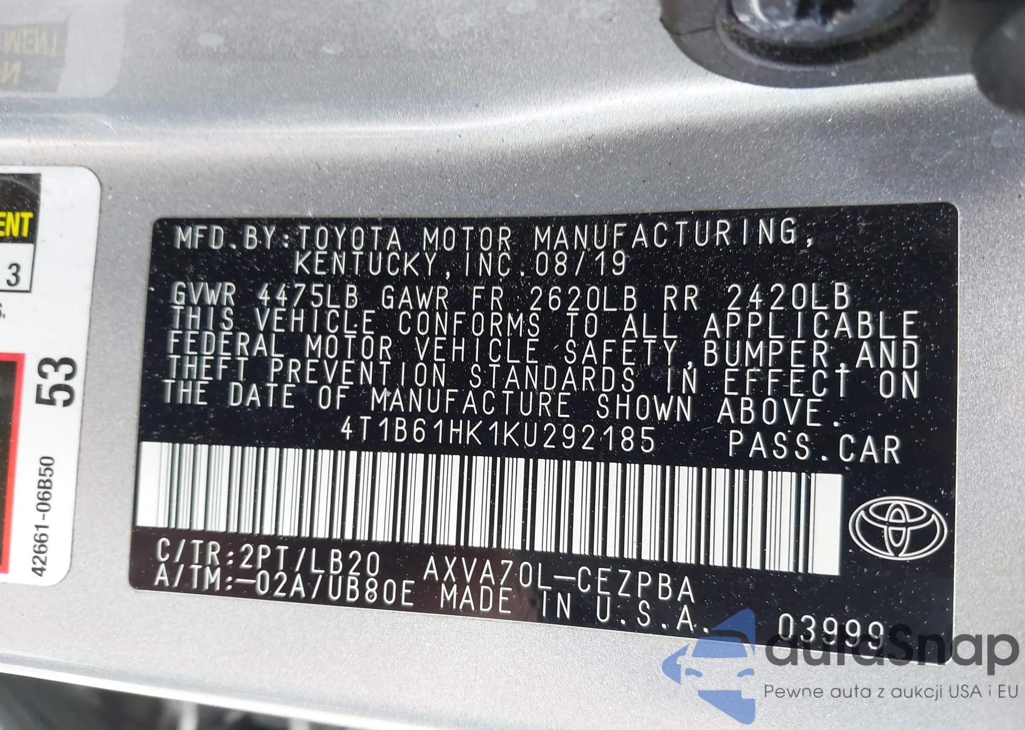 LOT: 42136880 VIN: 4T1B61HK1KU292185