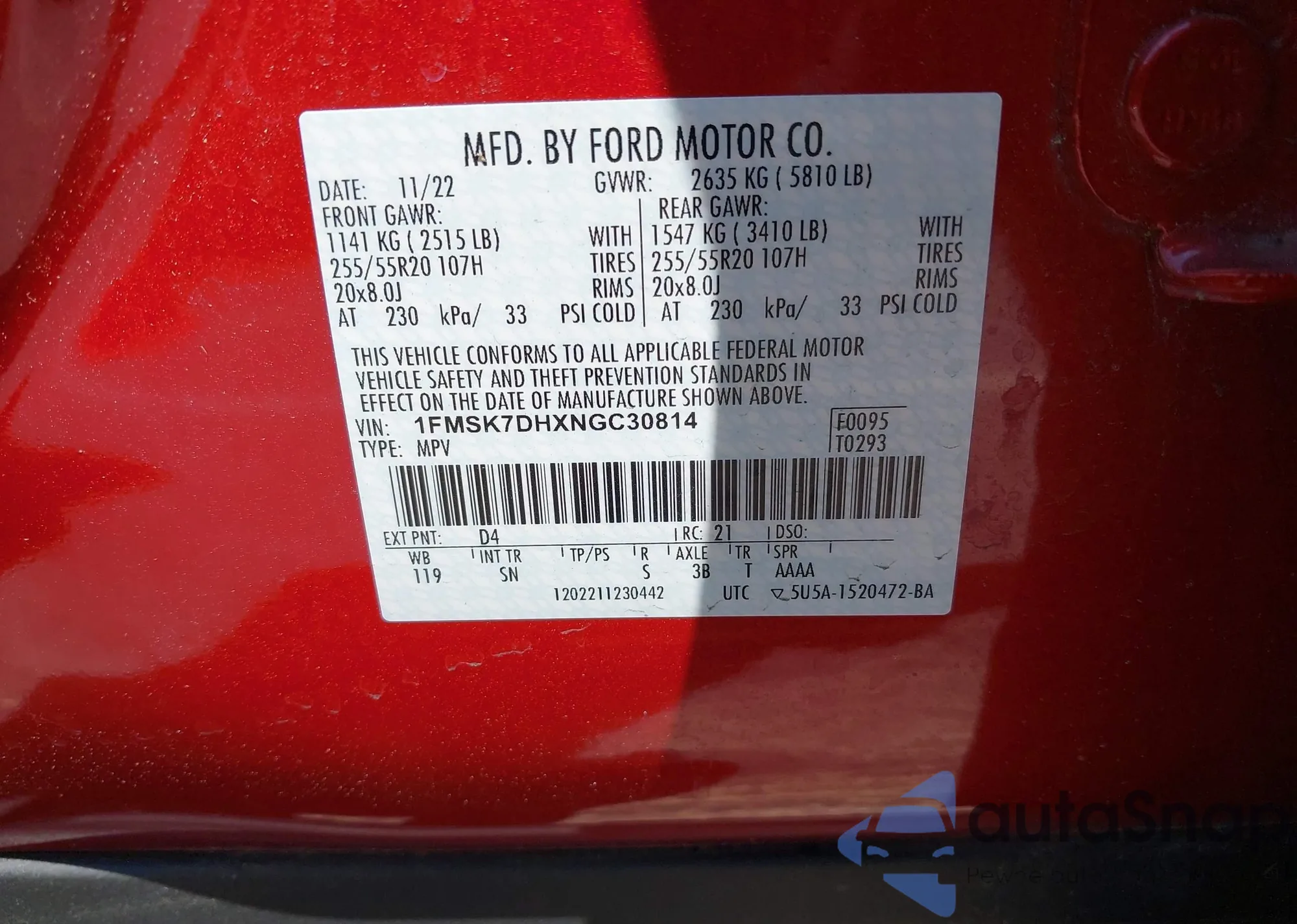 • VIN 1FMSK7DHXNGC30814