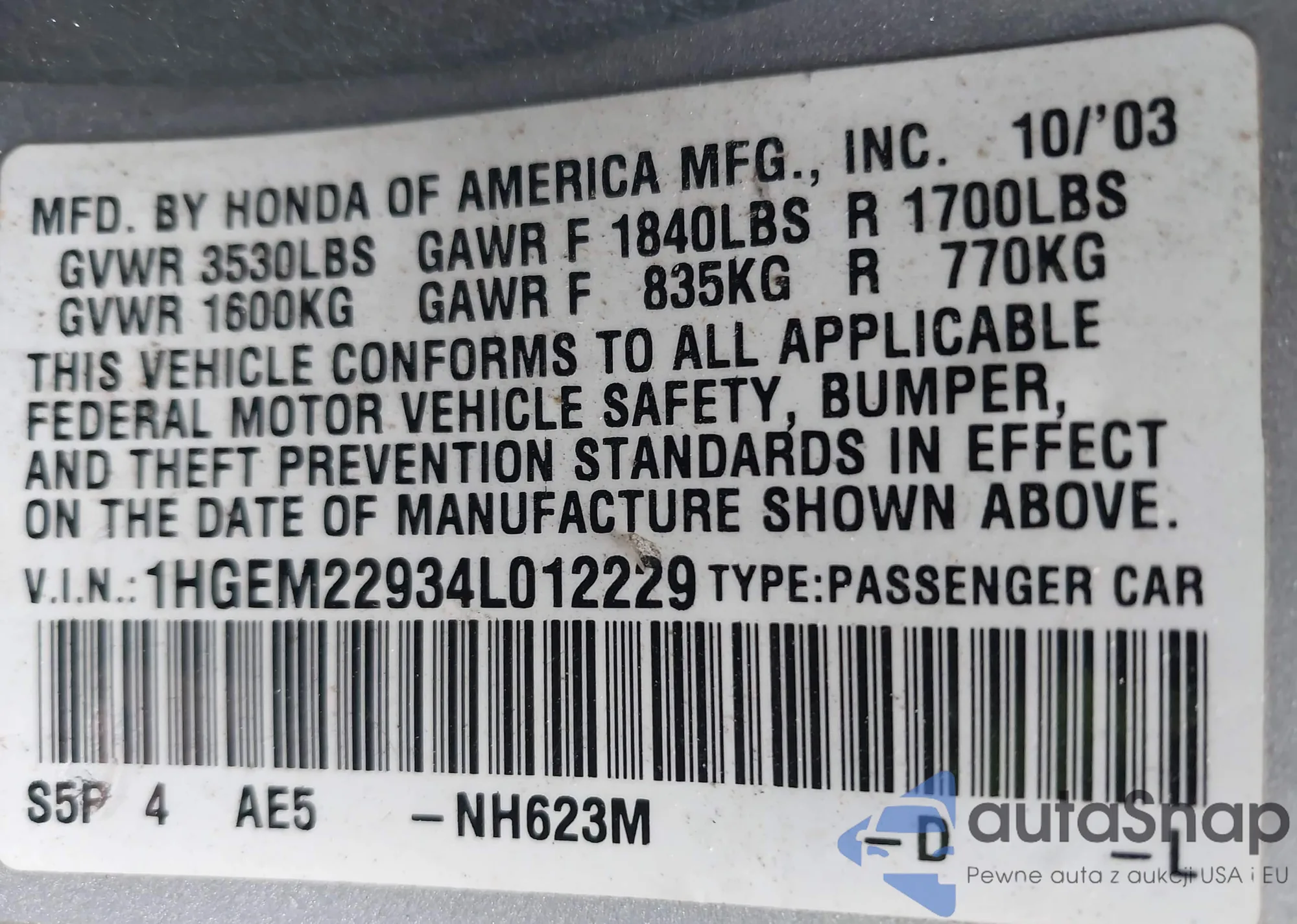 LOT: 42175481 VIN: 1HGEM22934L012229