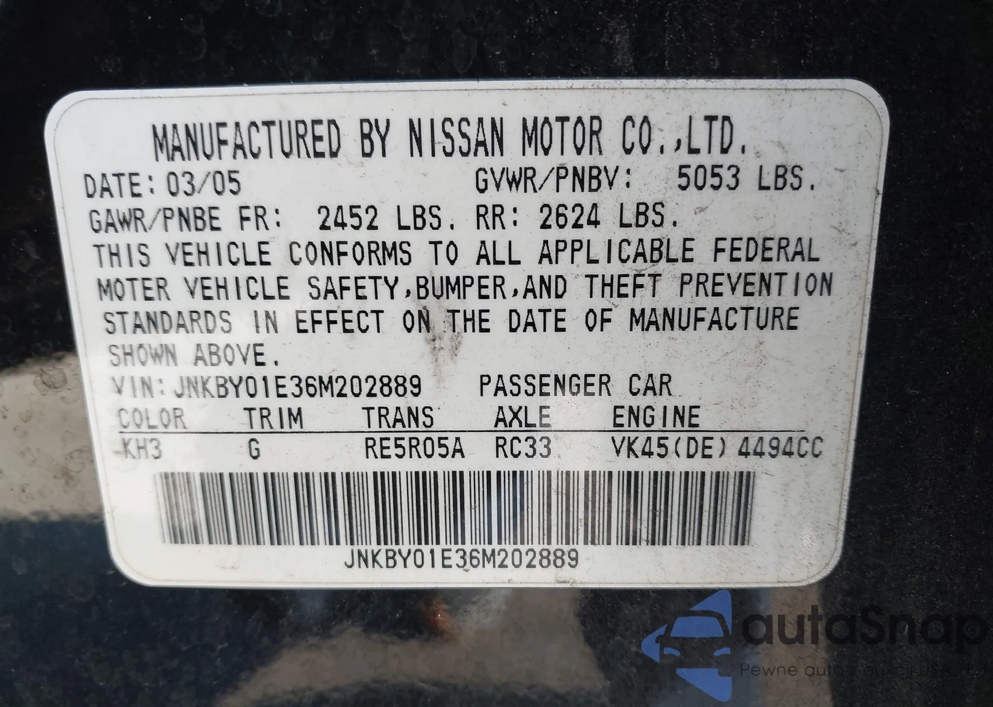LOT: 42542190 VIN: JNKBY01E36M202889