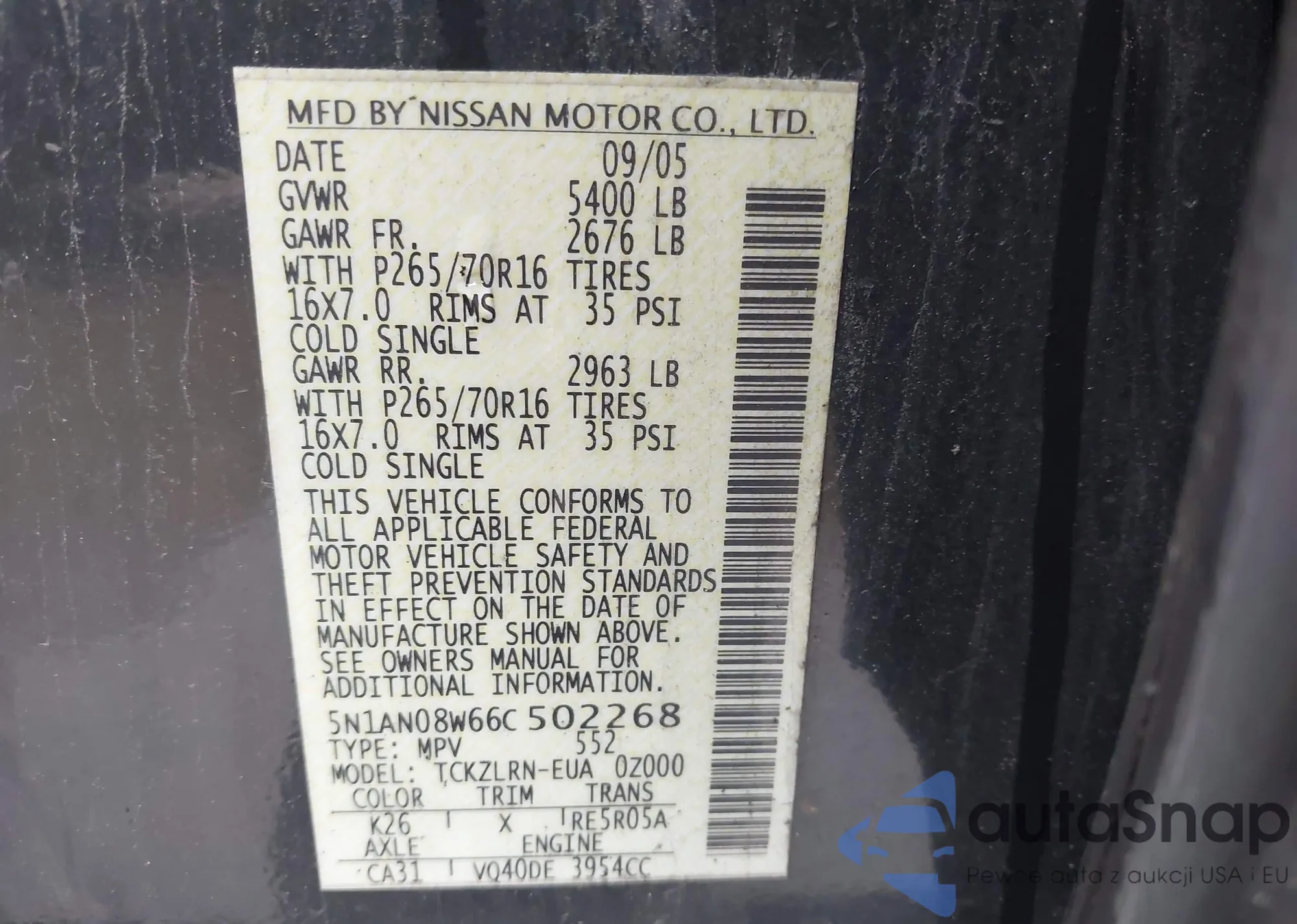 • VIN 5N1AN08W66C502268