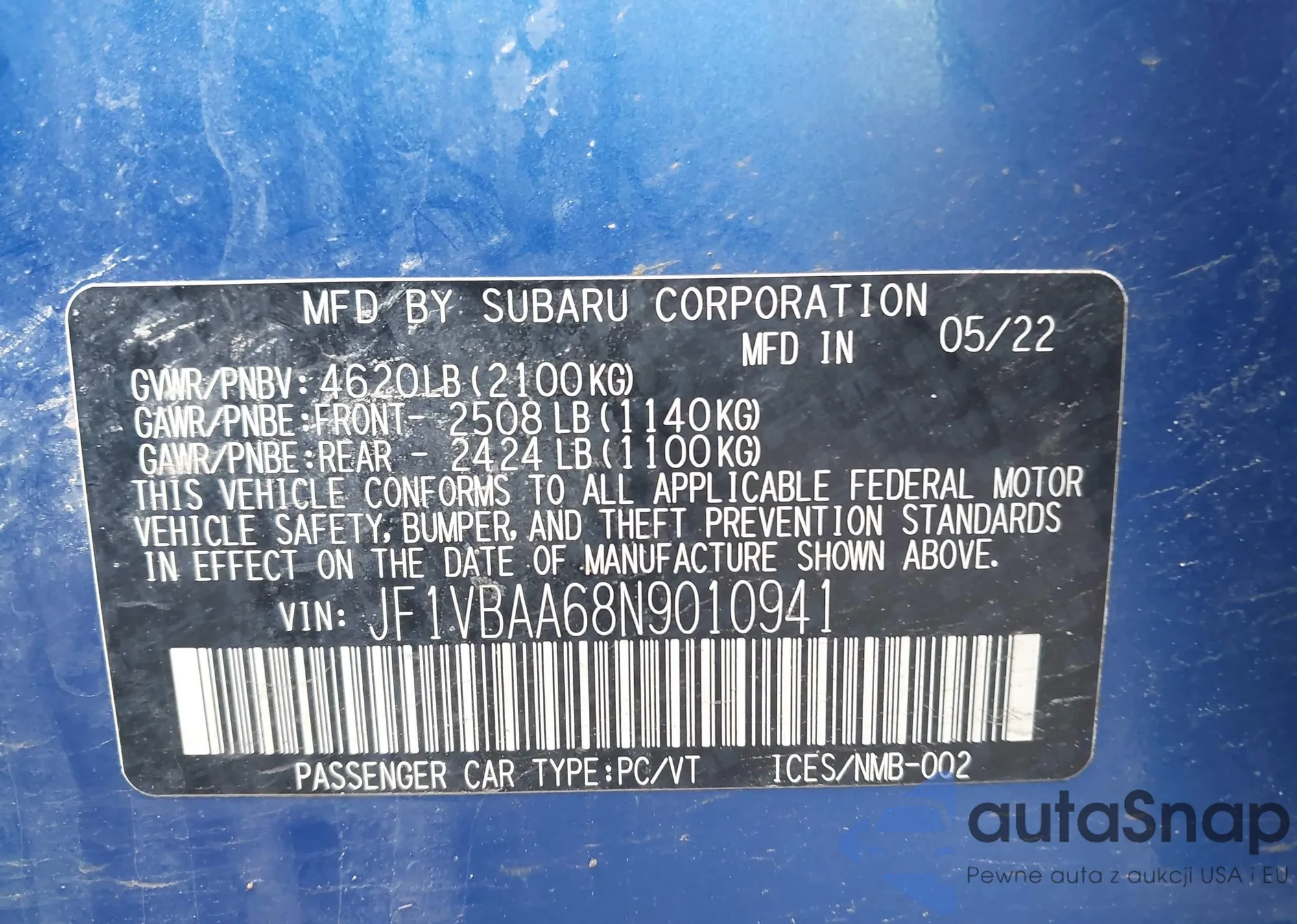 LOT: 42365334 VIN: JF1VBAA68N9010941