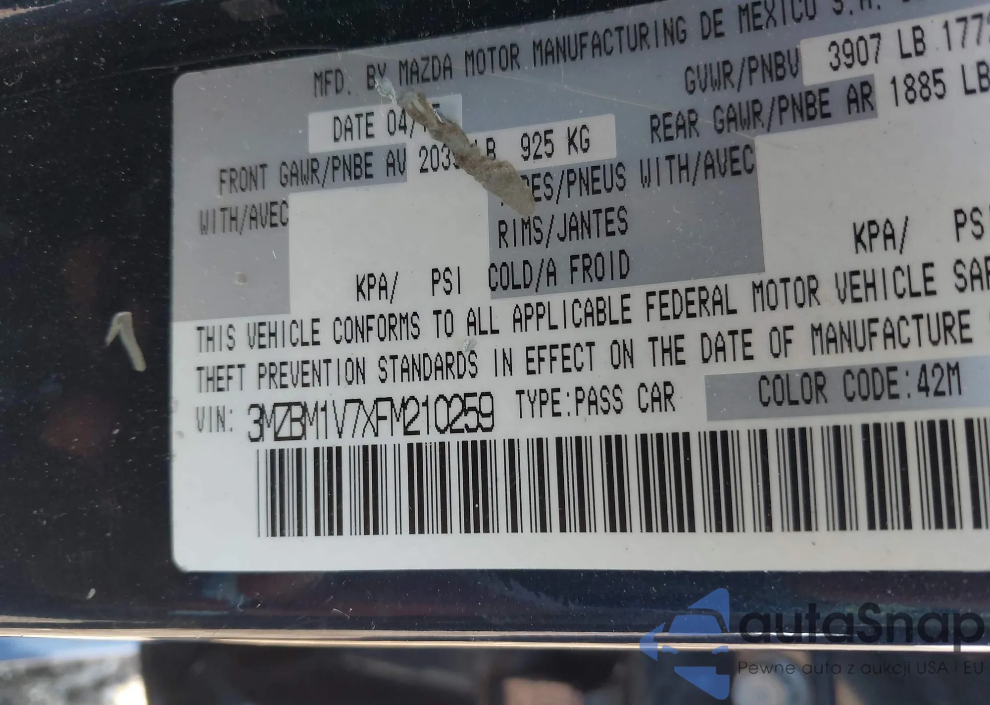 LOT: 42292322 VIN: 3MZBM1V7XFM210259
