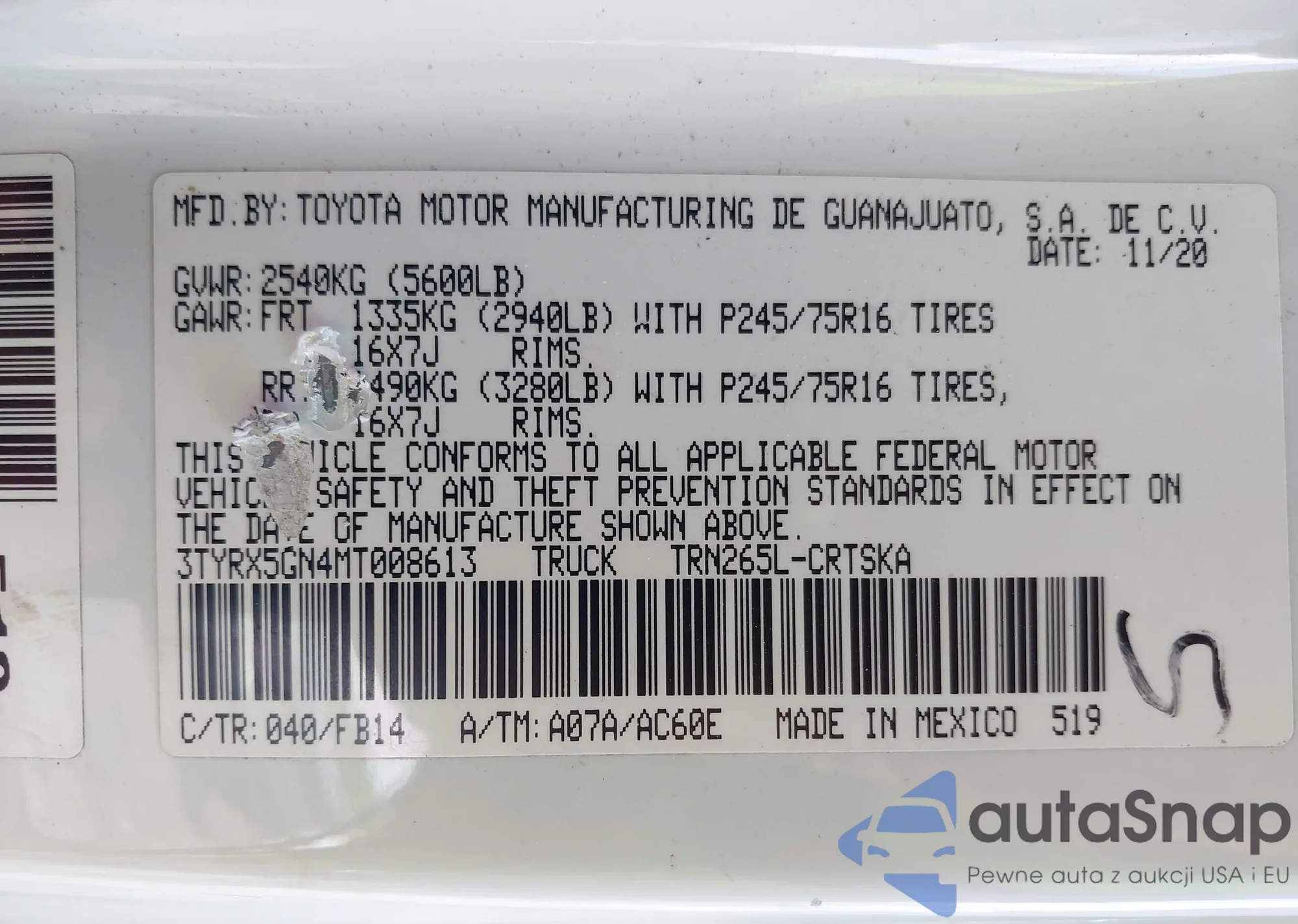 • VIN 3TYRX5GN4MT008613