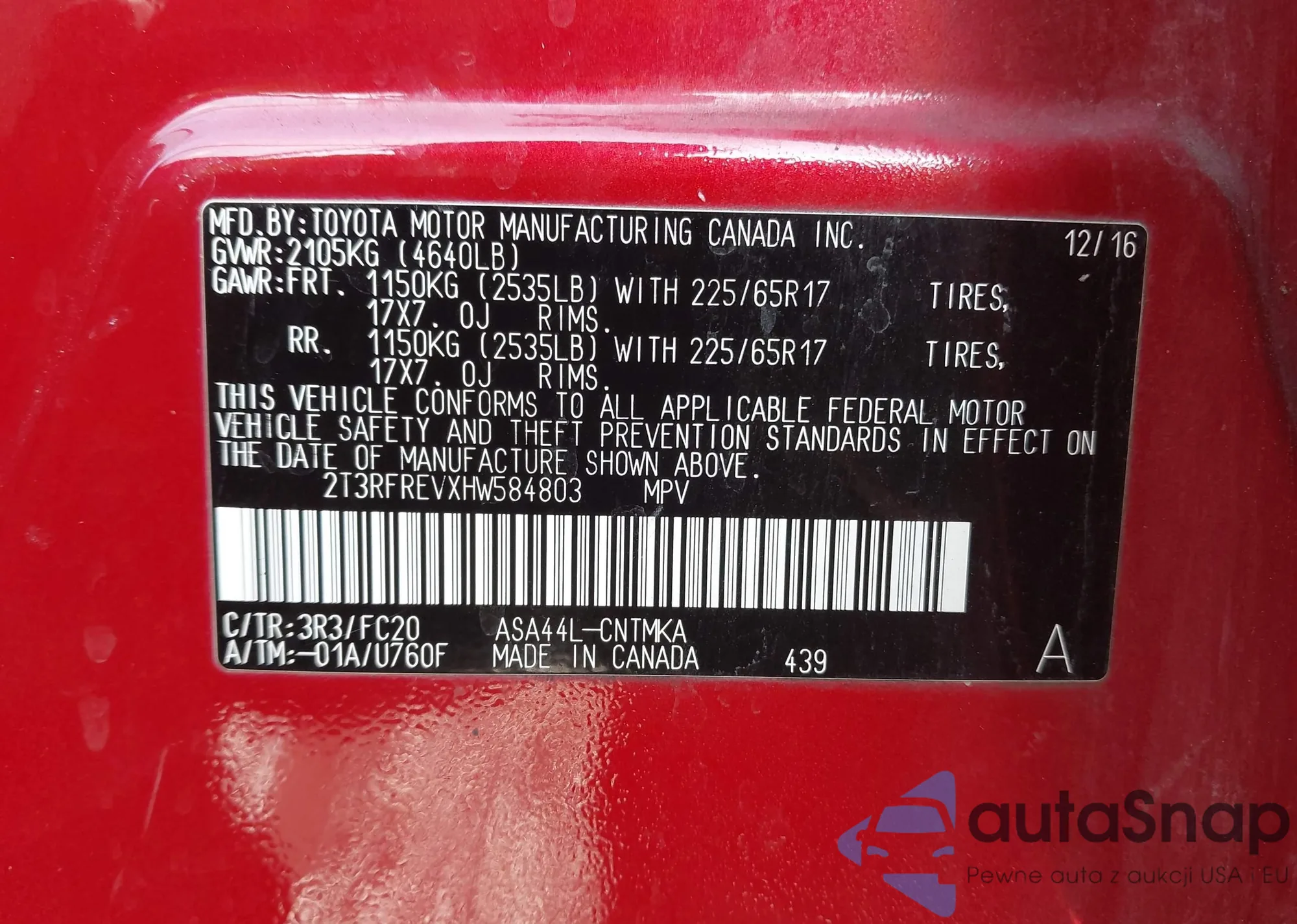 LOT: 42525988 VIN: 2T3RFREVXHW584803