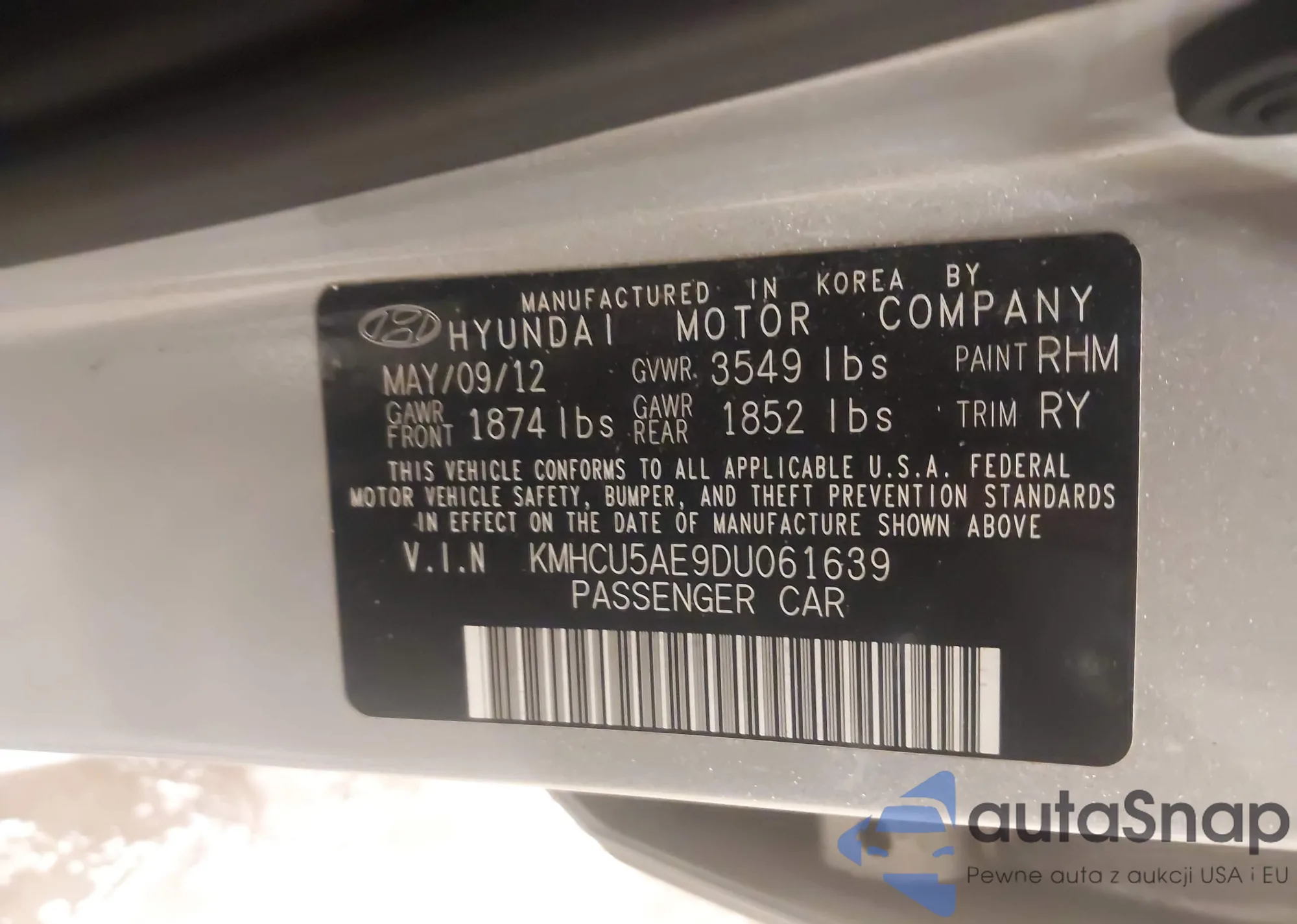 • VIN KMHCU5AE9DU061639