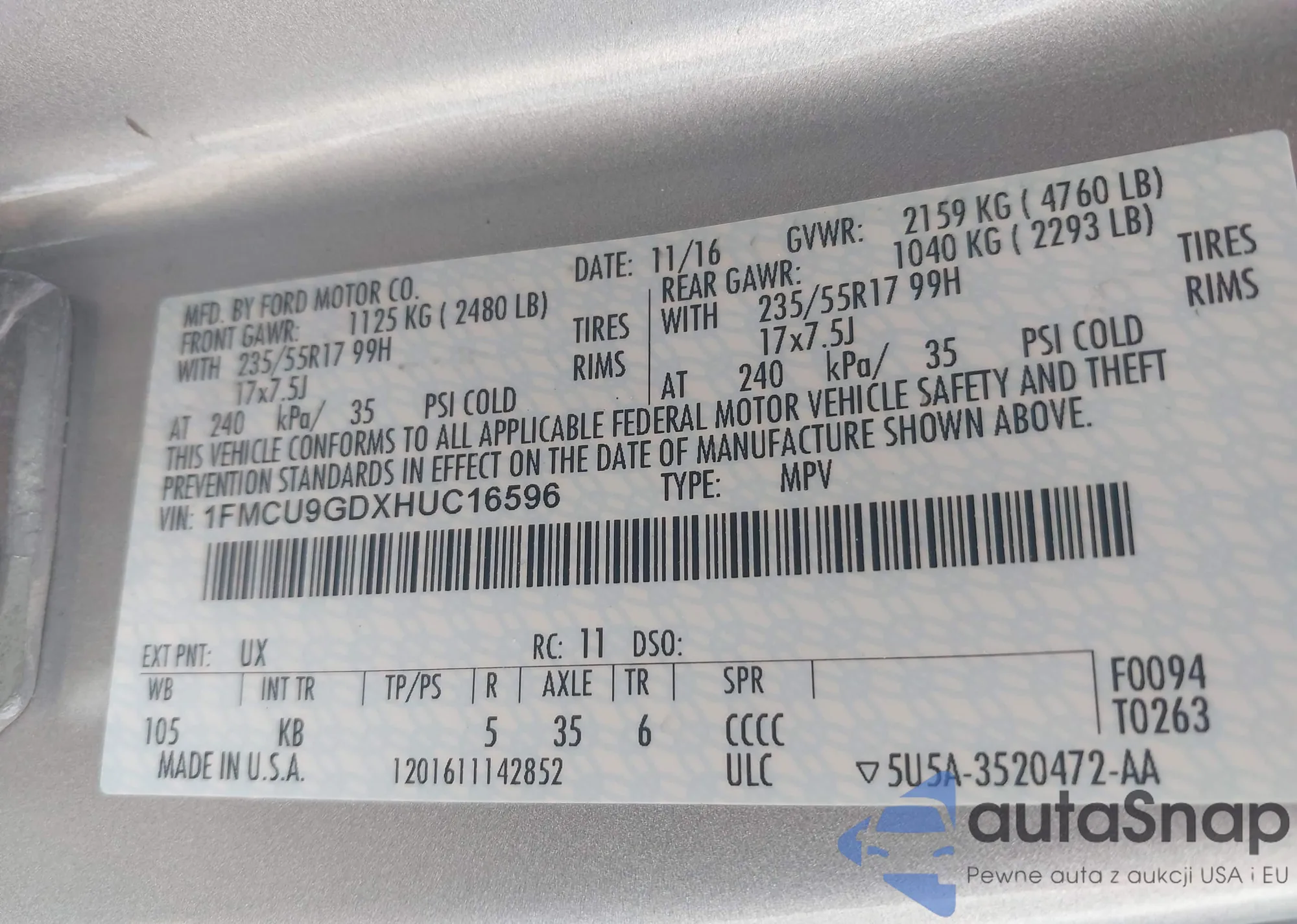 LOT: 42268731 VIN: 1FMCU9GDXHUC16596