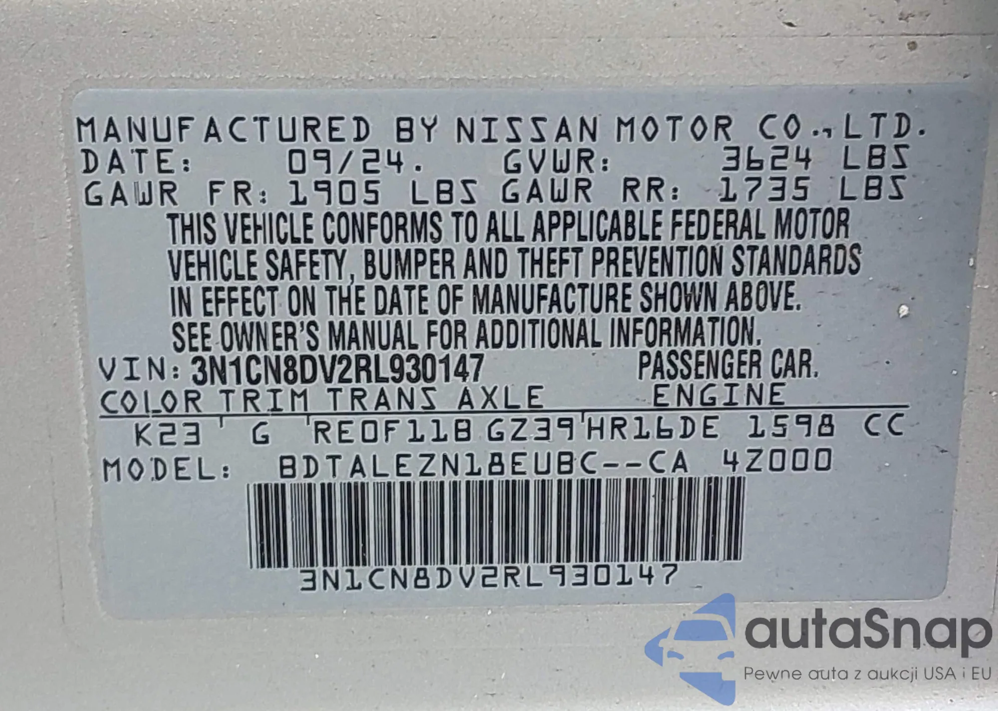• VIN 3N1CN8DV2RL930147