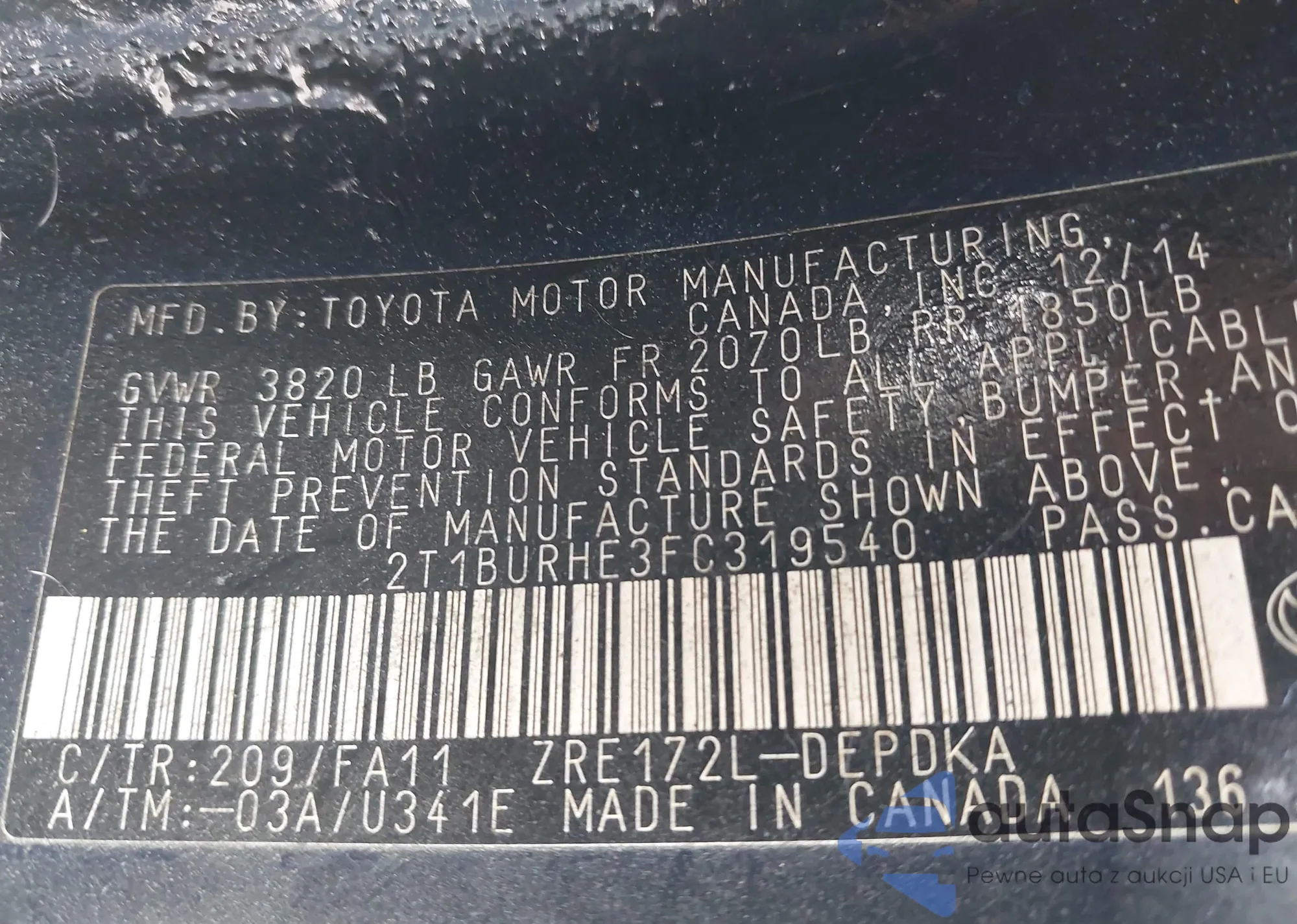• VIN 2T1BURHE3FC319540