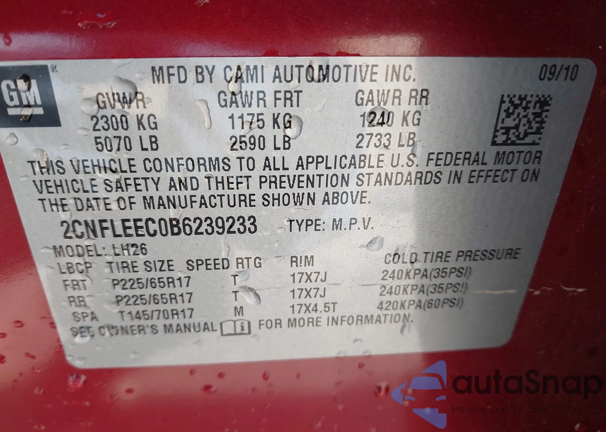 LOT: 42340860 VIN: 2CNFLEEC0B6239233