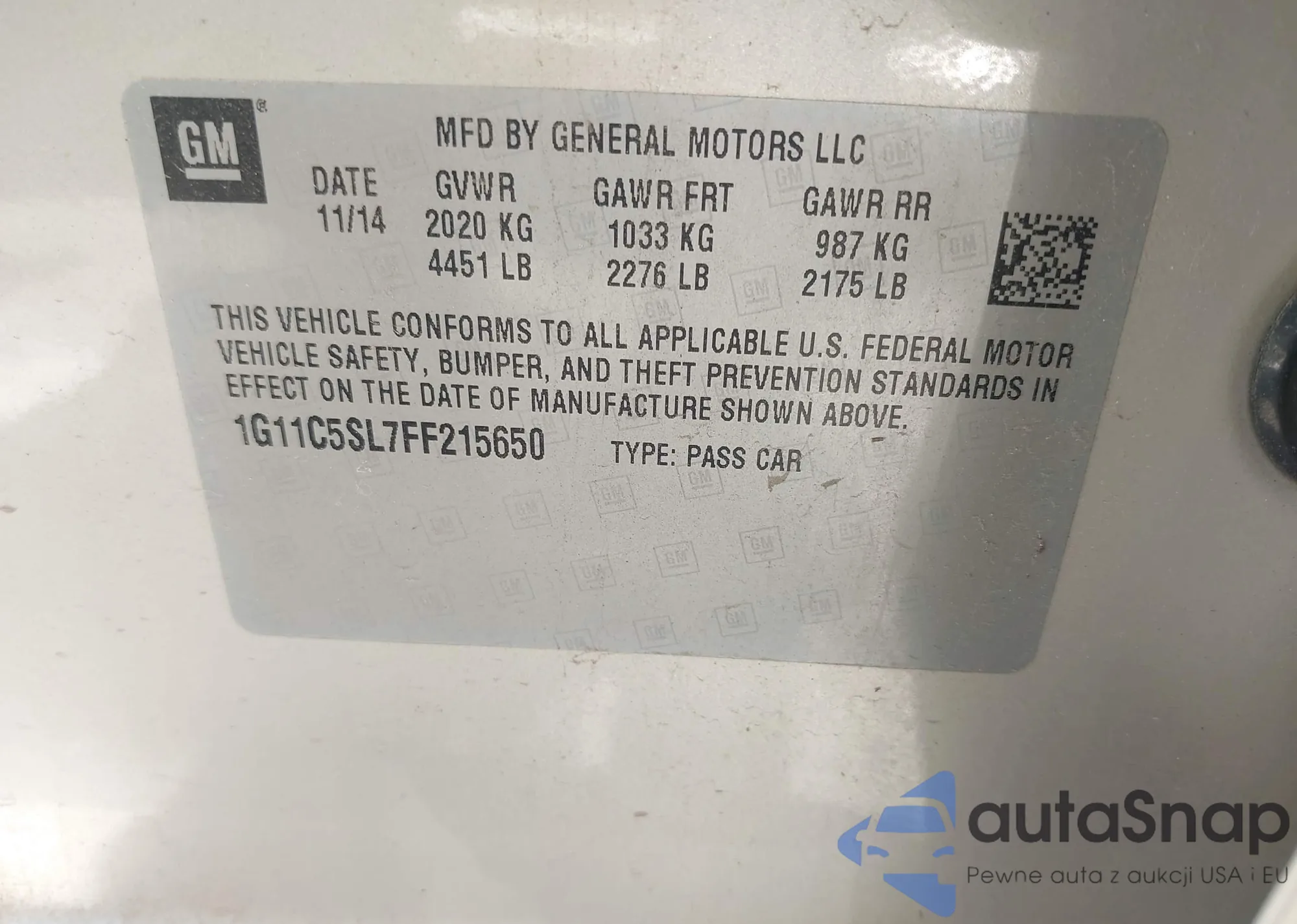 LOT: 42258388 VIN: 1G11C5SL7FF215650