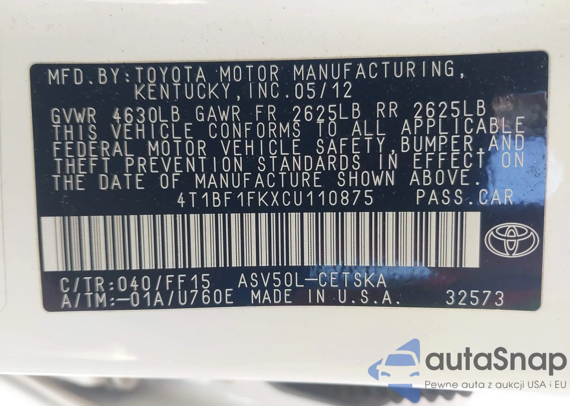 LOT: 42307286 VIN: 2T3W1RFV7LC050989