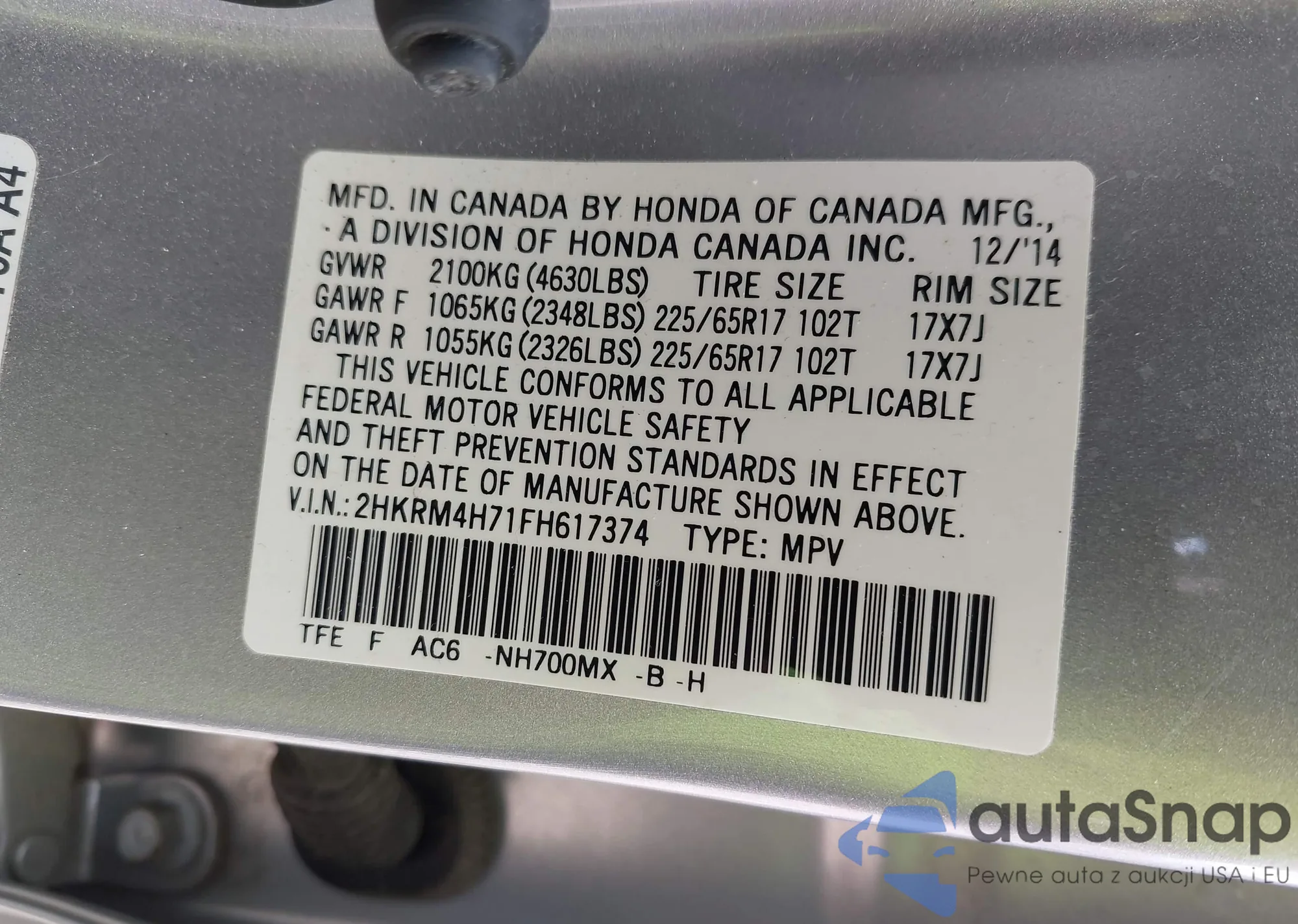 • VIN 2HKRM4H71FH617374