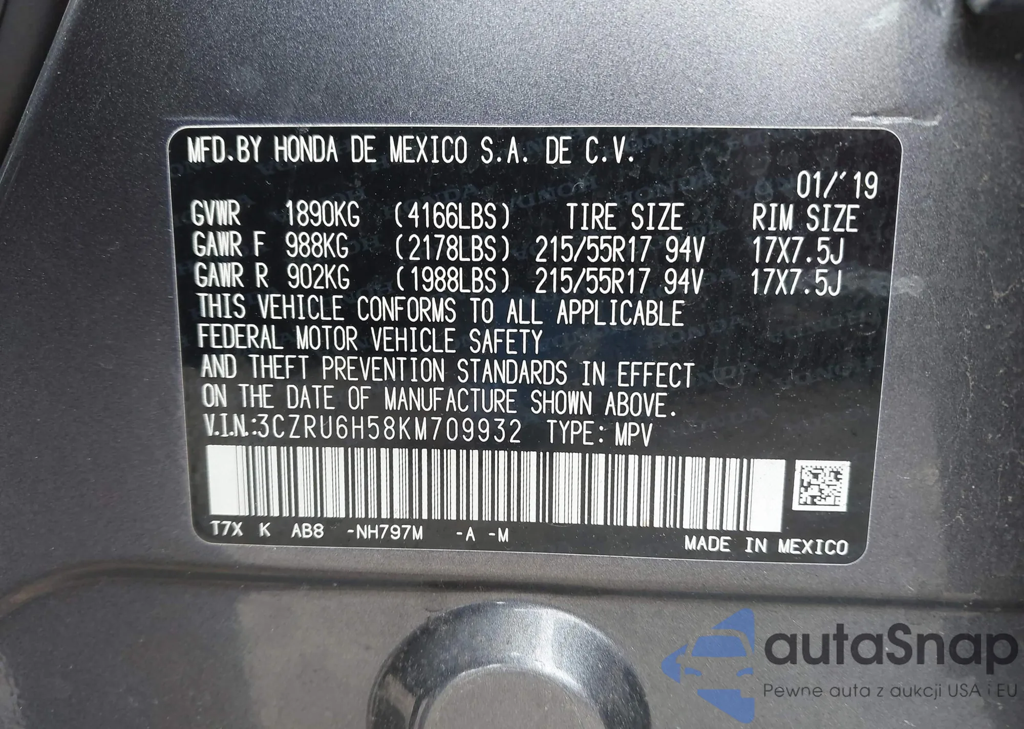 • VIN 3CZRU6H58KM709932