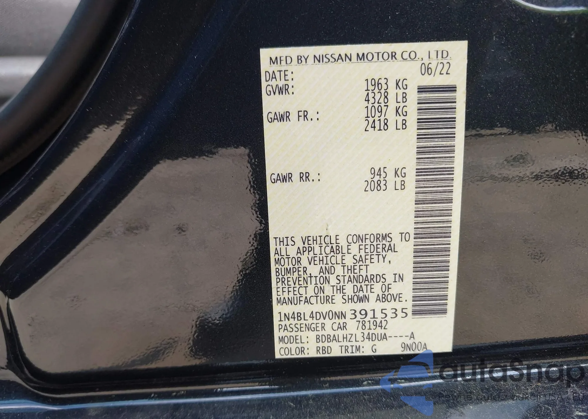 LOT: 42356718 VIN: 1N4BL4DV0NN391535