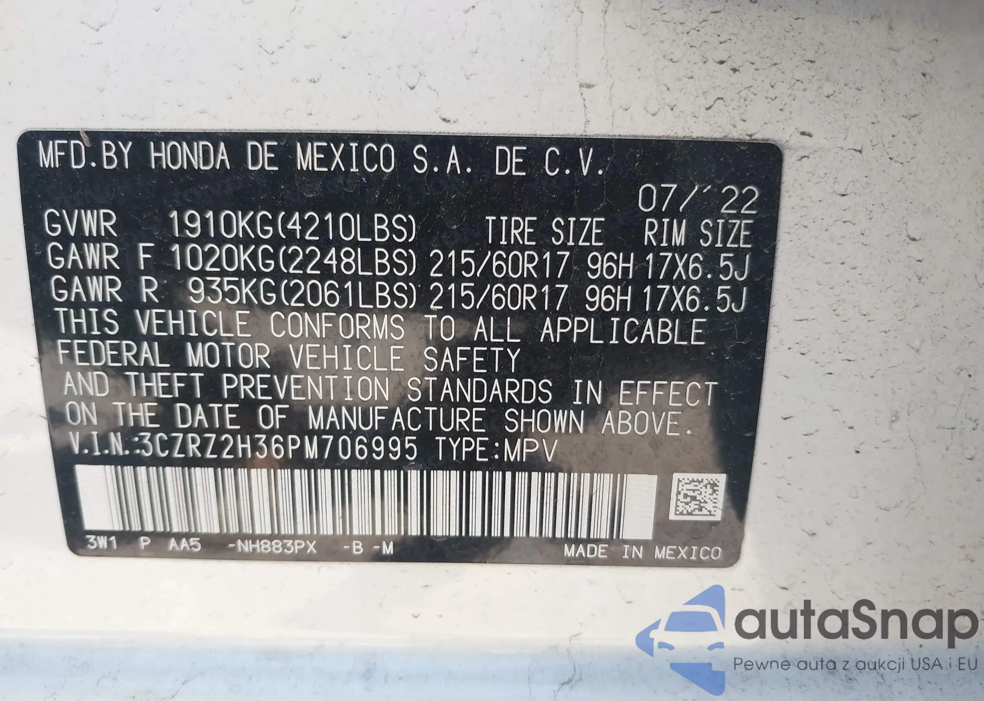 • VIN 3CZRZ2H36PM706995